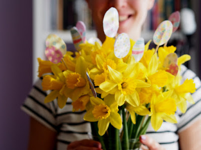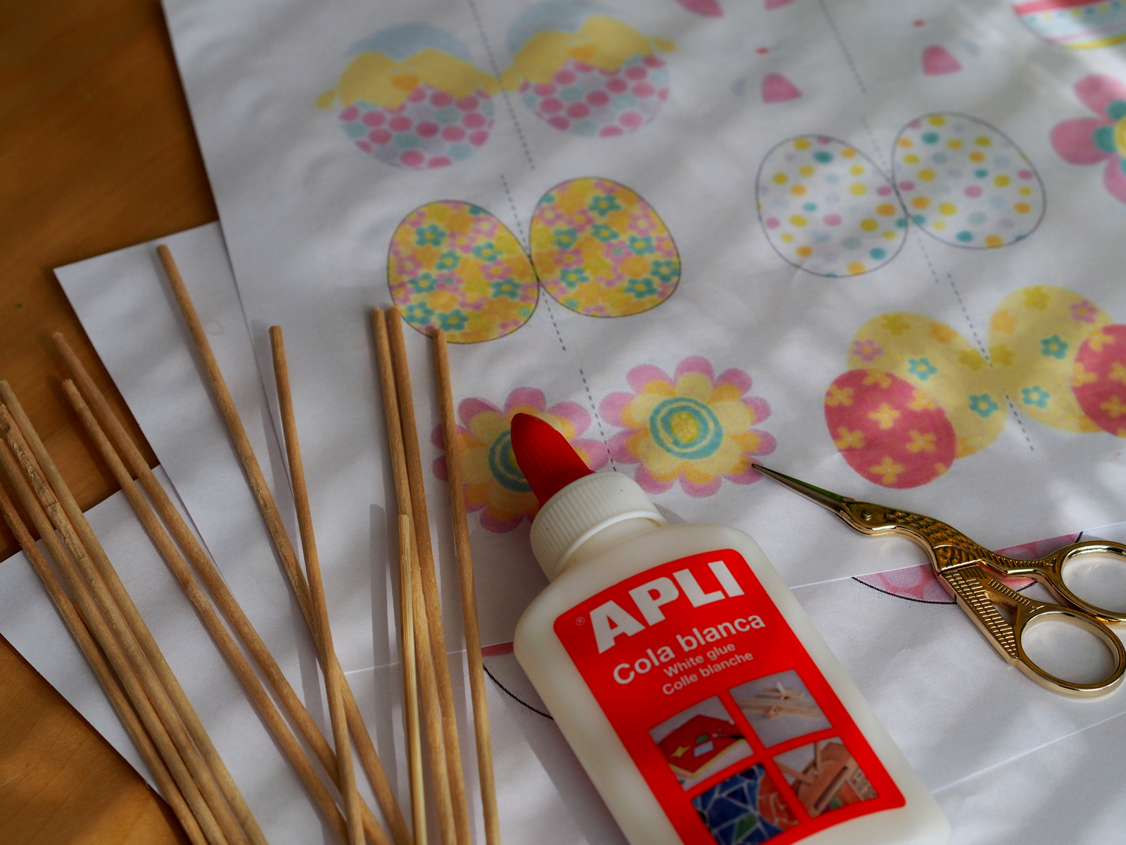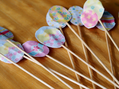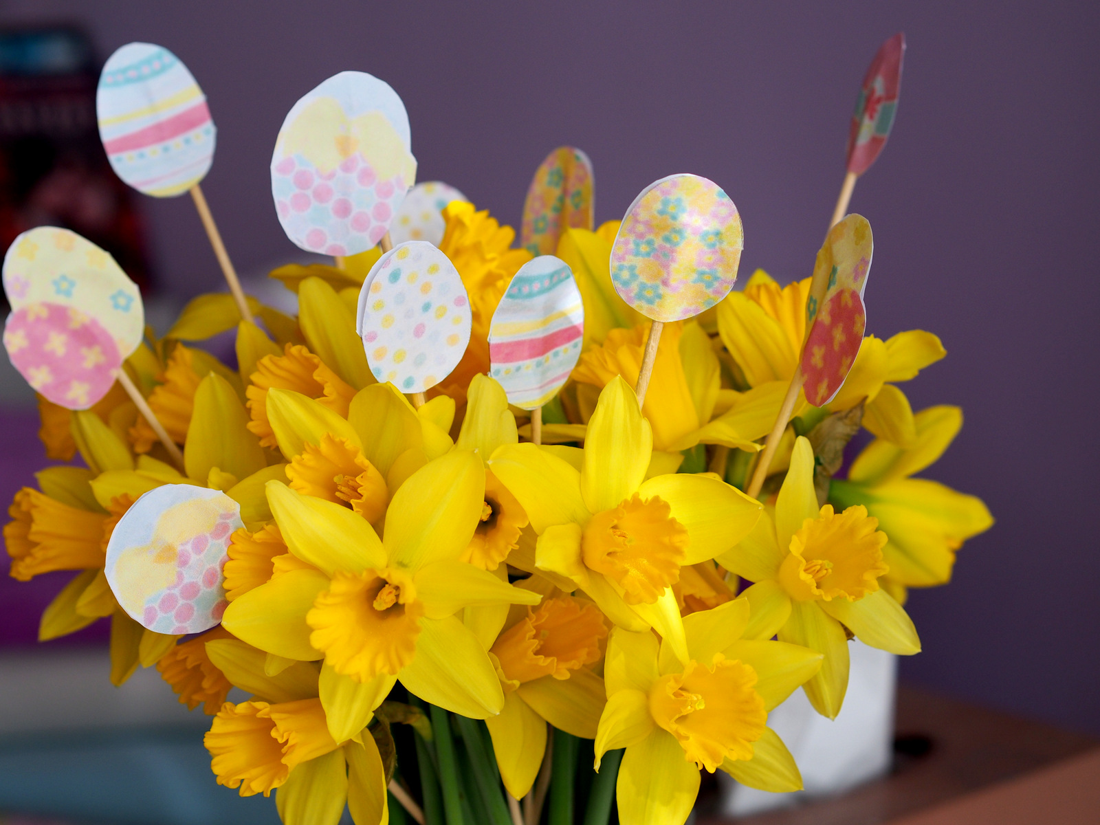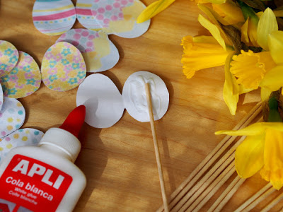 Postup je jednoduchý a naozaj last minute 🙂 Vystrihnite vajíčka, tak aby vám zostali spolu dve časti, aj keď to omylom prestrihnete, na dve samostatné časti, tak nevadí. Zlepte ich lepidlom, pri rozotieraní si pomôžte špajdlou, ktorú potom prilepte do stredu papierového vajíčka. Poriadne zatlačte a nechajte chvíľu uschnúť. Potom napichajte do jarnej kytice a veľkonočná výzdoba je na svete 🙂