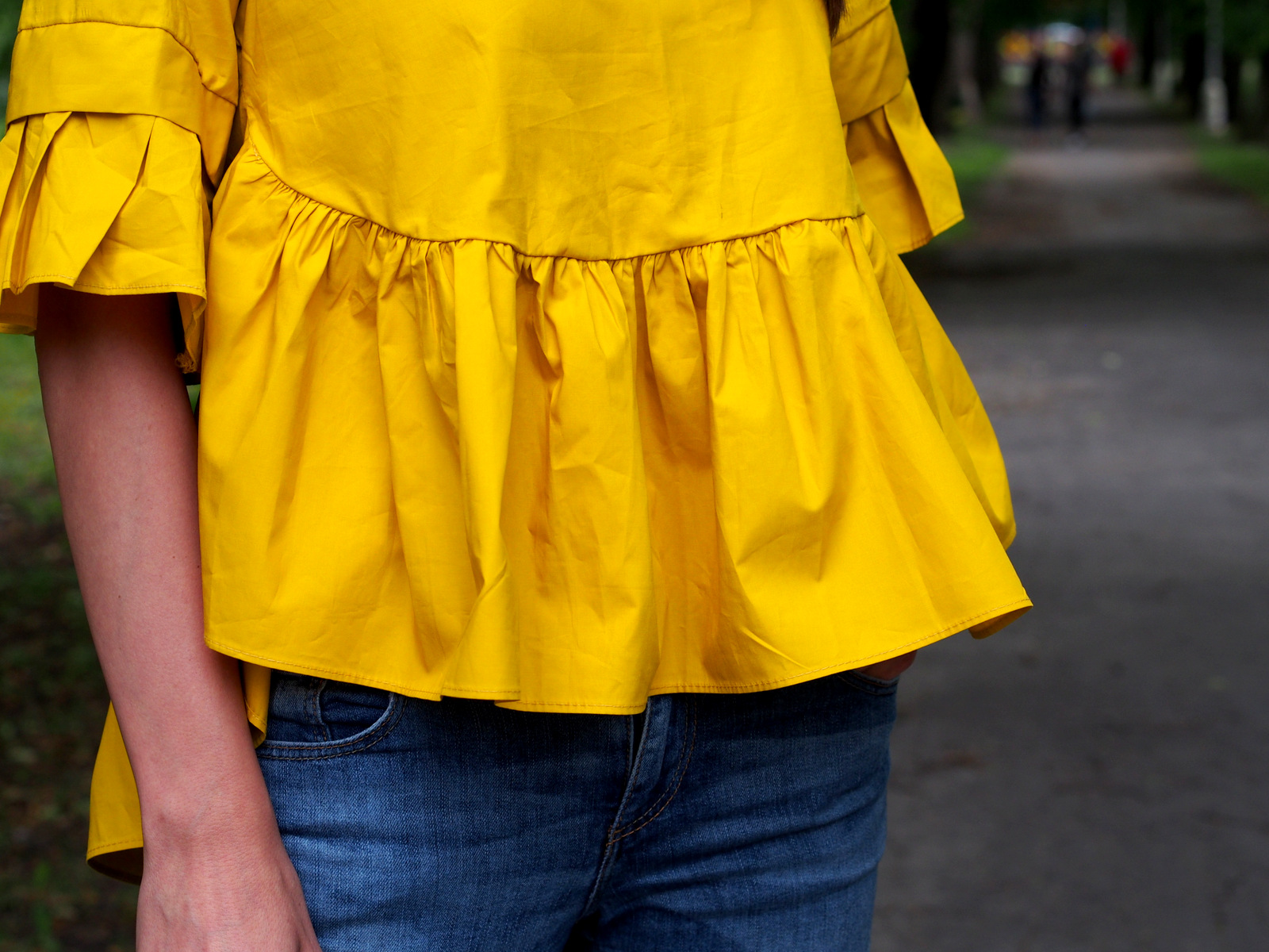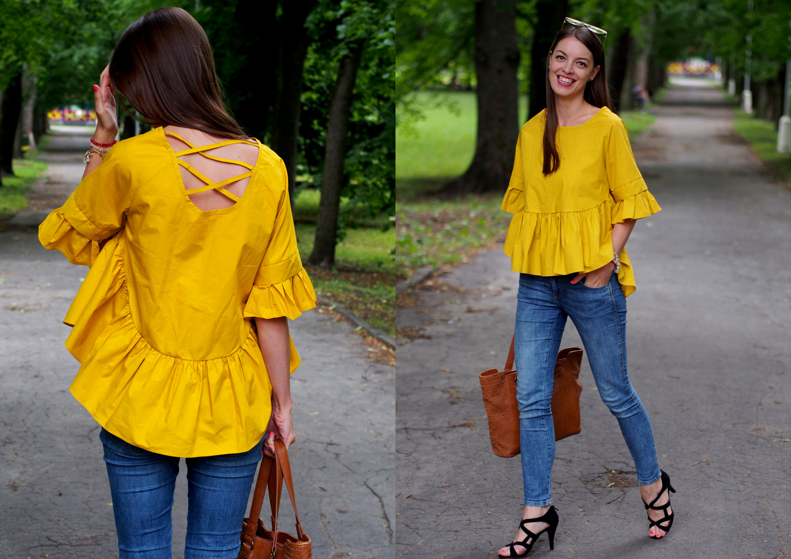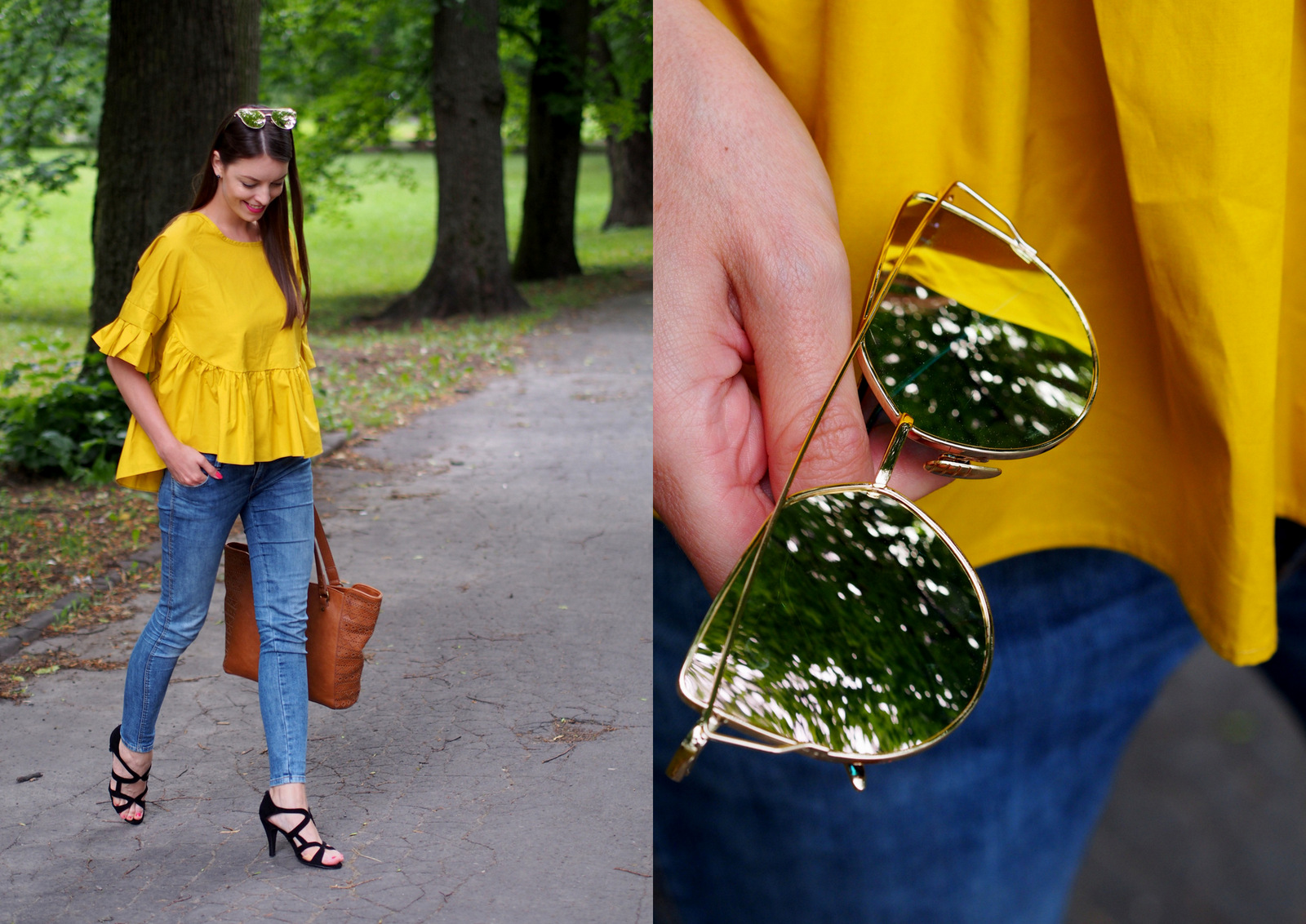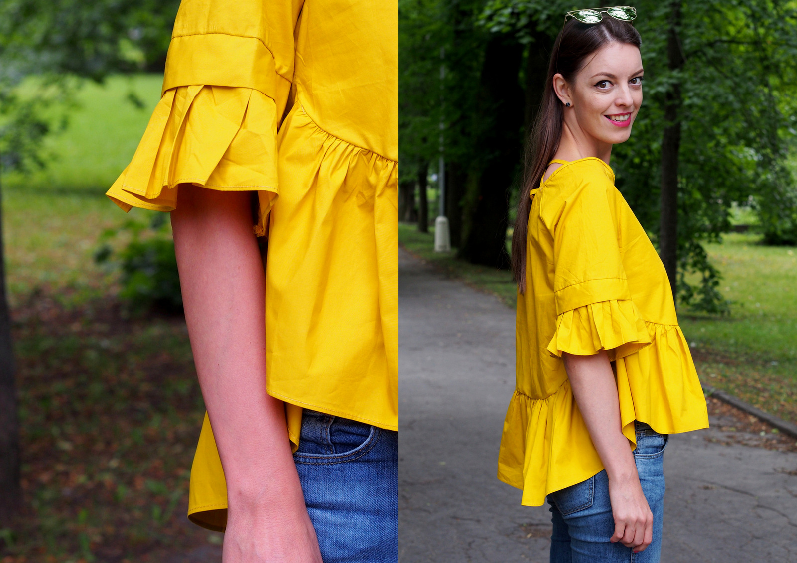 Zbožňujem blúzky, ktoré sú zaujímavé nie len farbou, ale aj detailami. Niekto by povedal, že blúzka má zvláštny strih, možno by ju pomenoval aj ako neforemnú, a iného by na vešiaku ani nezaujala. Pre mňa je zaujímavá, výrazná a originálna, v ktorej určite zaujmete. Blúzka má krásnu farbu a intenzívne som sa snažila nájsť presné označenie tejto farby, pretože si myslím, že označenie “yellow” ju až tak nevystihuje. Najviac podobná je medová, jantárová alebo žlto-červená. Ak máte iný názor kľudne mi ho napíšte do komentára a tejto farbe nájdem skutočný názov 🙂 Pekne sa kombinuje s farbami ako hnedá, azúrová, zelená, čierna a pre odvážnejšie môžete outfit doplniť výraznými červenými doplnkami. Pripravujem článok s pomôckou ako kombinovať jednotlivé farby, v ktorom sa dočítate zaujímavosti nie len o žltých odtieňoch. Do outfitu som doplnila nové slnečné okuliare, ktoré majú zrkadlové sklá v ružovej farbe. Zaujímavé je, že farba skla je zeleno-modrá, takže svet vidíte v iných farbách :). Okuliare sú veľmi pekné, ale v outifte sa dosť ťažko fotia. V plnej kráse ich nájdete na e-shope, odkaz nájdete pod fotkou ako vždy 🙂 Ale späť k blúzke. Okrem farebných kombinácii sa zamerajte aj na spodnú časť oblečenia. Nezabudnite, že blúzka vás, kvôli voľnému strihu a množstvu volánov, opticky zväčší. Podporuje to aj riasenie v oblasti bruška a skrátená dĺžka v prednej časti. Na fotkách nižšie môžete vidieť ako v blúzke budete vyzerať zboku. Odporúčam kombinovať s úzkymi nohavicami alebo púzdrovými sukňami. Ak sa vám blúzka páči a rozmýšľate nad jej kúpou, tak doplním informáciu, že sa veľmi krčí a materiál je na mňa trošku umelý … alebo som len ja rozmaznaná handmade kúskami, pretože v poslednej dobe som na takýto materiál natrafila v množstve kamenných obchodov, pri ktorých som zvyknutá na jemnučké materiály. Nebojte sa a buďte odvážna, siahnite po výrazných farbách, dokombinujte obľúbenými kúskami a verte bude trendy a šik 🙂