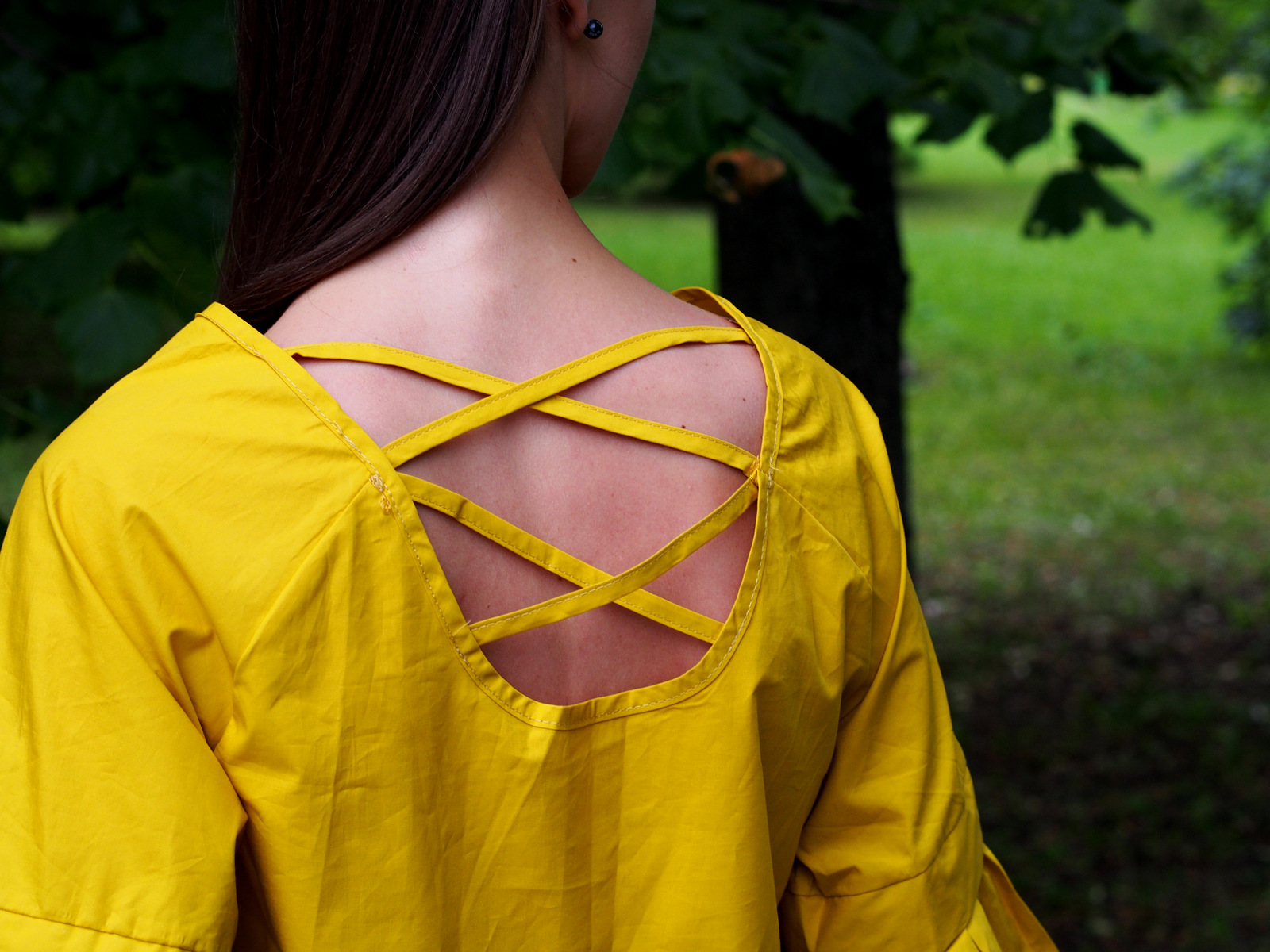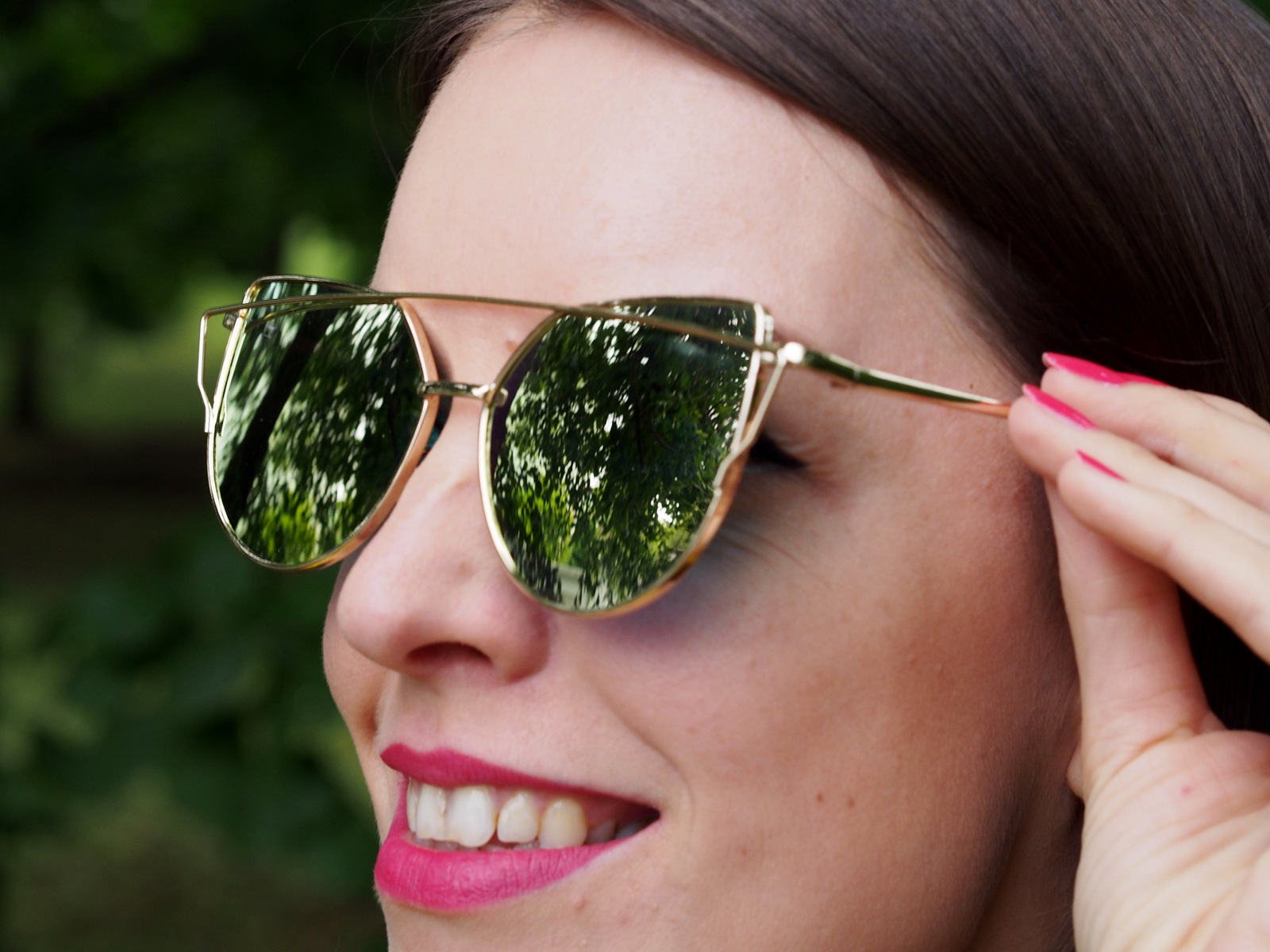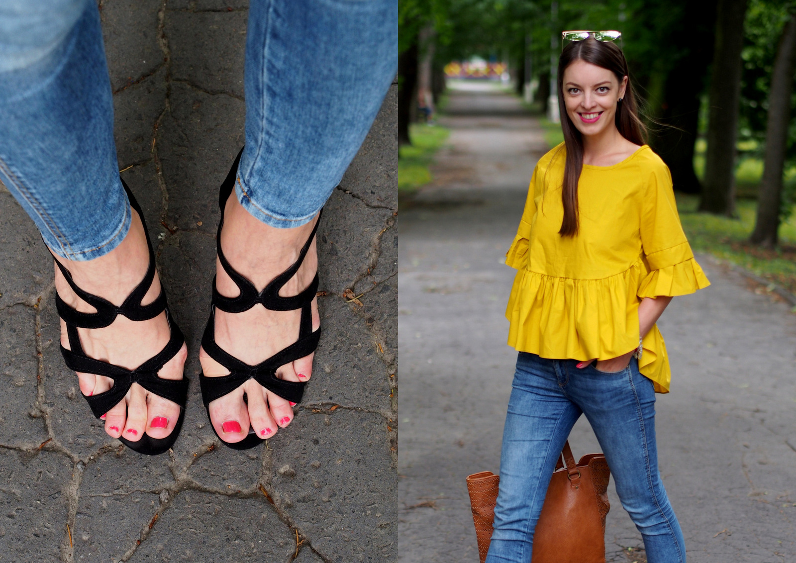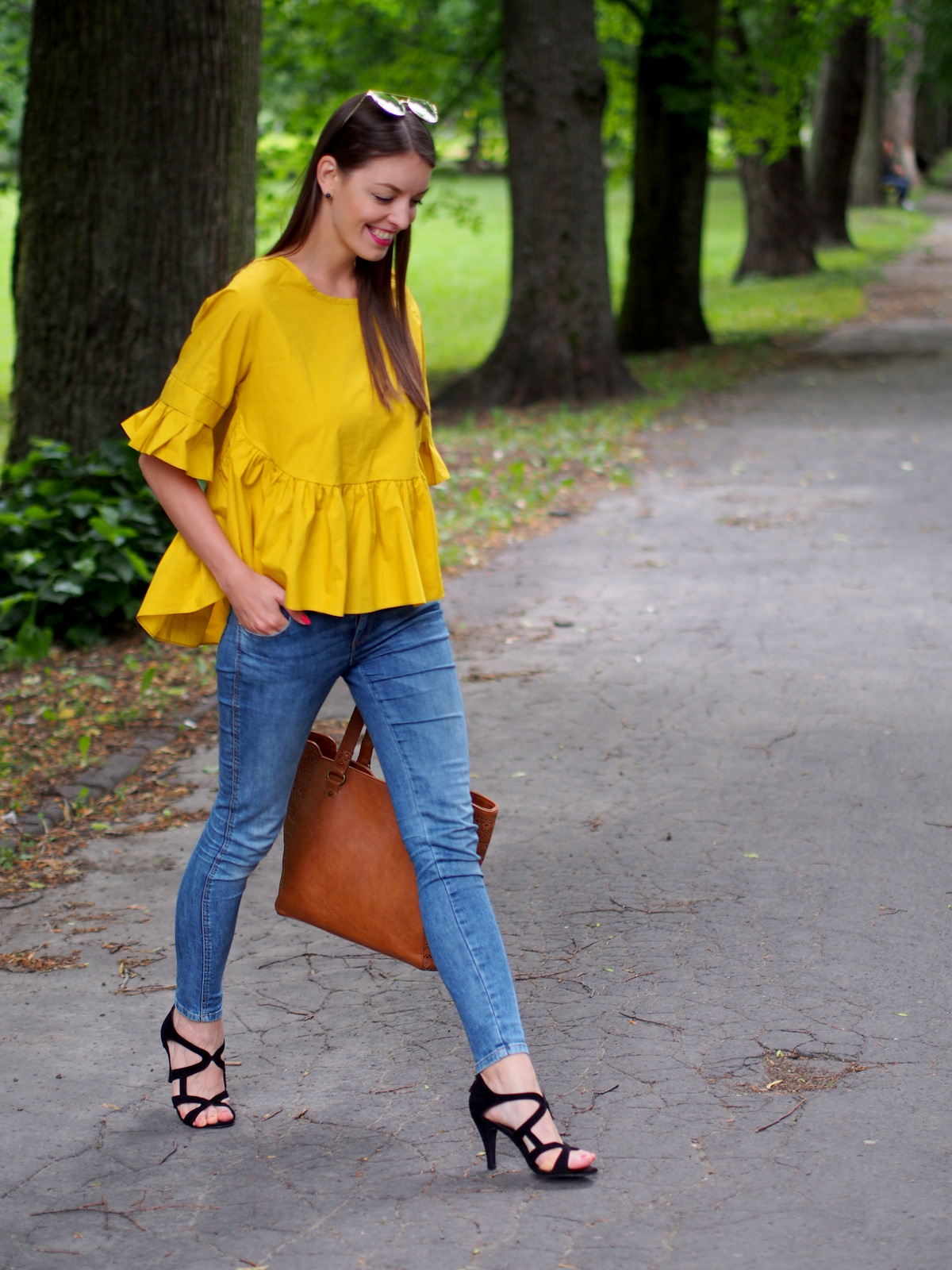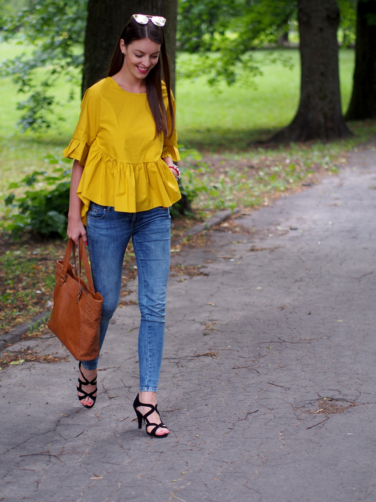 Zbožňujem blúzky, ktoré sú zaujímavé nie len farbou, ale aj detailami. Niekto by povedal, že blúzka má zvláštny strih, možno by ju pomenoval aj ako neforemnú, a iného by na vešiaku ani nezaujala. Pre mňa je zaujímavá, výrazná a originálna, v ktorej určite zaujmete. Blúzka má krásnu farbu a intenzívne som sa snažila nájsť presné označenie tejto farby, pretože si myslím, že označenie “yellow” ju až tak nevystihuje. Najviac podobná je medová, jantárová alebo žlto-červená. Ak máte iný názor kľudne mi ho napíšte do komentára a tejto farbe nájdem skutočný názov 🙂 Pekne sa kombinuje s farbami ako hnedá, azúrová, zelená, čierna a pre odvážnejšie môžete outfit doplniť výraznými červenými doplnkami. Pripravujem článok s pomôckou ako kombinovať jednotlivé farby, v ktorom sa dočítate zaujímavosti nie len o žltých odtieňoch. Do outfitu som doplnila nové slnečné okuliare, ktoré majú zrkadlové sklá v ružovej farbe. Zaujímavé je, že farba skla je zeleno-modrá, takže svet vidíte v iných farbách :). Okuliare sú veľmi pekné, ale v outifte sa dosť ťažko fotia. V plnej kráse ich nájdete na e-shope, odkaz nájdete pod fotkou ako vždy 🙂 Ale späť k blúzke. Okrem farebných kombinácii sa zamerajte aj na spodnú časť oblečenia. Nezabudnite, že blúzka vás, kvôli voľnému strihu a množstvu volánov, opticky zväčší. Podporuje to aj riasenie v oblasti bruška a skrátená dĺžka v prednej časti. Na fotkách nižšie môžete vidieť ako v blúzke budete vyzerať zboku. Odporúčam kombinovať s úzkymi nohavicami alebo púzdrovými sukňami. Ak sa vám blúzka páči a rozmýšľate nad jej kúpou, tak doplním informáciu, že sa veľmi krčí a materiál je na mňa trošku umelý … alebo som len ja rozmaznaná handmade kúskami, pretože v poslednej dobe som na takýto materiál natrafila v množstve kamenných obchodov, pri ktorých som zvyknutá na jemnučké materiály. Nebojte sa a buďte odvážna, siahnite po výrazných farbách, dokombinujte obľúbenými kúskami a verte bude trendy a šik 🙂