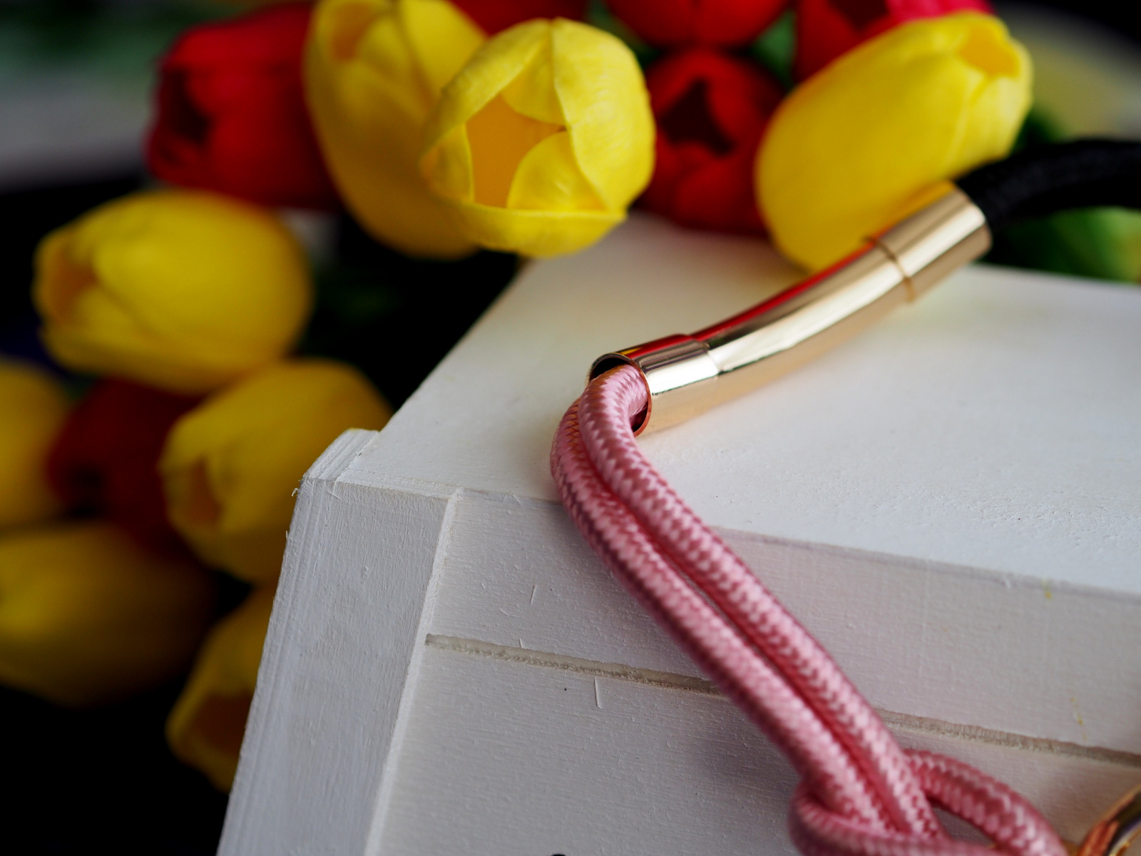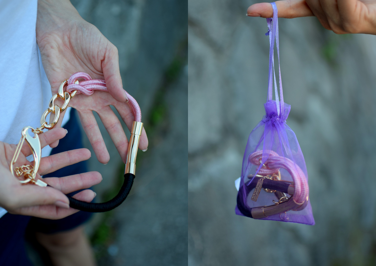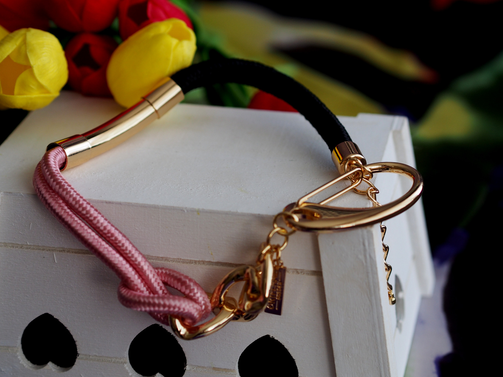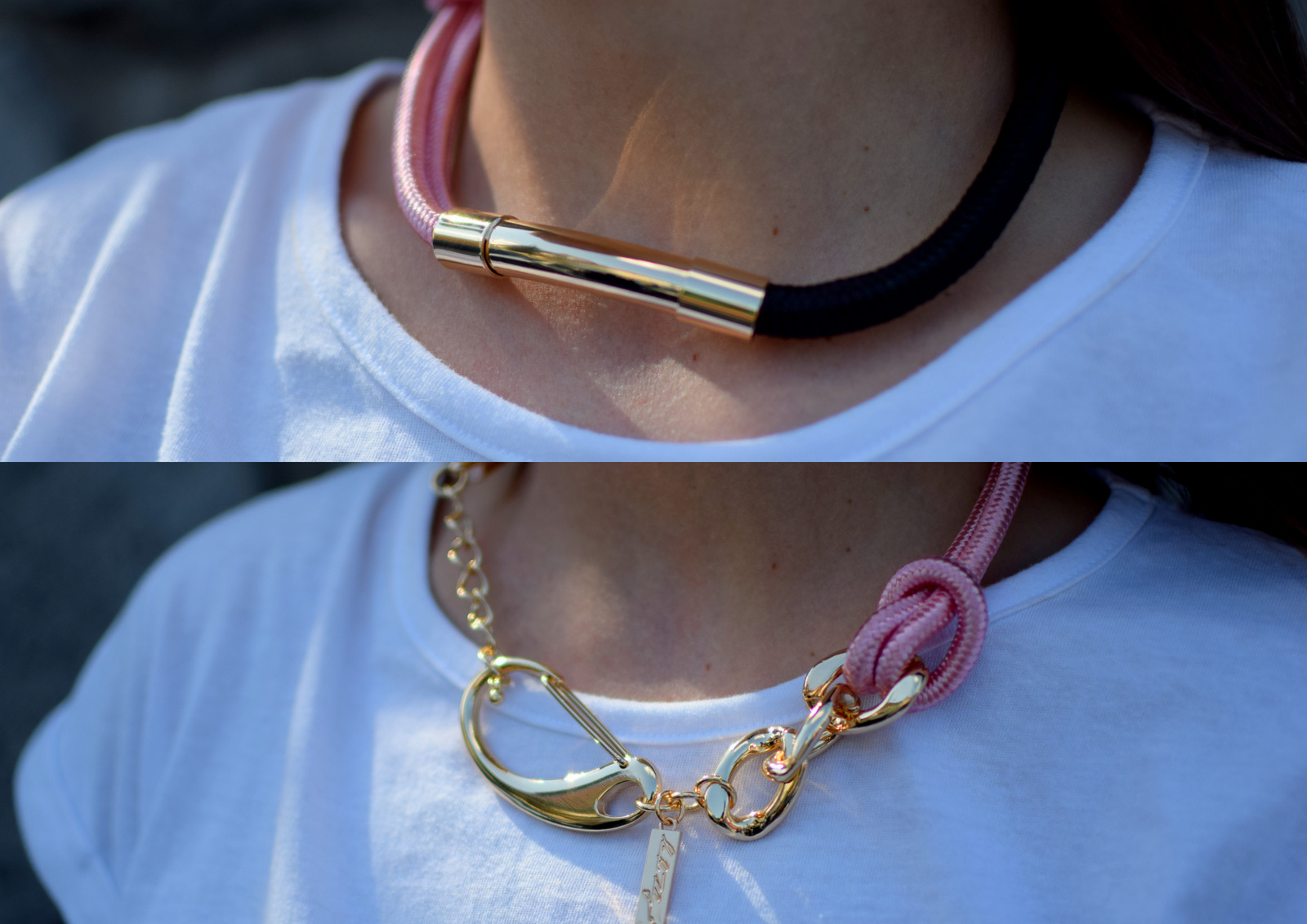 Nápadný náhrdelník v zlatom tóne s polyesterovými šnúrkami ružovej a čiernej farby, ktoré v strede zdobí zlatistá valcovitá ozdoba. Zapína sa masívnou zlatistou prackou z ušľachtilej ocele. Doplnok, ktorý jednoducho musíte mať.