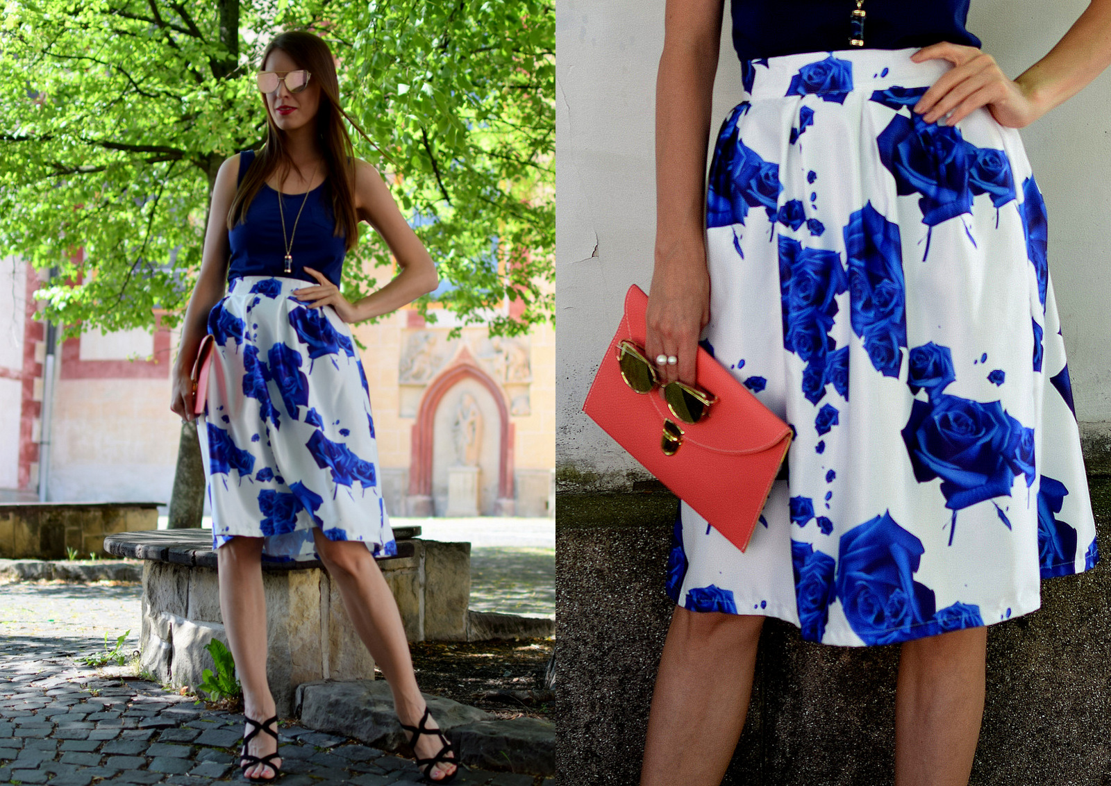 Pestrofarebné, vzorované a hlavne nariasené sukne siahajúce pod kolená som začala nosiť približne pred dvoma rokmi. Moja vášeň začala modrou sukňou resp. prvú čiernu som mala už pred troma rokmi. Vtedy to bolo niečo iné, neokukané a kúpiť sa dali prevažne iba na e-shopoch. Dokázala som stráviť aj hodinu surfovaním a hľadaním originálnej sukni (lebo látky sa vtedy nedali kúpiť alebo boli veľmi drahé). Nazbieralo sa mi ich doma toľko, že zabrali jednu skriňu, takže som ich všetky posunula ďalej. Dnes už podobné sukne nájdete v každom obchode a v tých najrôznejších farbách a vzoroch. Bielo-modrá sukňa, ktorú vidíte na fotkách, ma zaujala hlavne farbou, lebo tmavomodrú mám veľmi rada. No čím sa na sukňu pozerám dlhšie a detailnejšie, poviem vám to na rovinu, tým mi príde viac a viac gýčovejšia. Modré ruže? Naozaj? Pýtam sa sama seba “Budeš ju skutočne nosiť?” Opäť som sa nechala zlákať a doma mám kúsok, ktorý nevynosím. Dnes som vyzdvihla na pošte ďalší balíček a pri čakaní v rade som sa zamyslela nad zmyslom týchto nákupov. Objednám, čakám dva-tri týždne, veľmi sa teším, a potom som sklamaná z materiálu, farby alebo veľkosti. Rozhodla som sa, že e-shopové nákupy oblečenia z ázijských krajín musím, a hlavne chcem, obmedziť (takže sem tam ešte nejaký nákup spomeniem). Stojí ma to veľa času, energie a odteraz budem e-shop využívať minimálne. Haló dievča veď si môžeš ušiť všetko, čo si vymyslíš. Takže plán je taký, že sa vrátim späť k recyklovaniu oblečenia zo sekáčov, čo ma napĺňa asi ešte viac ako šitie nových kúskov, ku ktorému sa samozrejme takisto vrátim vo väčšej miere. Doma mám ešte látku, ktorú som dostala na meniny, ktoré mám v decembri, ďalšiu na šortky mám už tretie leto a ružovú na blúzku, tak to už ani neviem kedy sme kupovali. Radšej budem venovať energiu do nových handmade kúskov, ktoré mi 100% sadnú, hľadania kvalitných kúskov v sekáčoch, ktoré sa dajú pretvoriť, ako do surfovania po e-shopoch a rozčuľovaniu sa, že mi opäť niečo nesadlo. Verím, že mi to vydrží čo najdlhšie a už nikdy nespadnem do virtuálneho nakupovania, ktoré sa mi tak trošku vymklo spod kontroly :). Dôležité je, že som si to uvedomila! Ešte pár outfitov s e-shopovými nákupmi na blogu nájdete, a potom to veľmi obmedzím.Všetky kúsky, ktoré mi nesadli veľkosťou, sú mi krátke alebo ich jednoducho nenosím nájdete vo veľkom výpredaji TU. Ak máte o niečo záujem napíšte mi, zatiaľ tam chýbajú rozmery oblečenia, ale väčšina je S,M, potrebujem uvoľniť skriňu na nové handmade kúsky 🙂