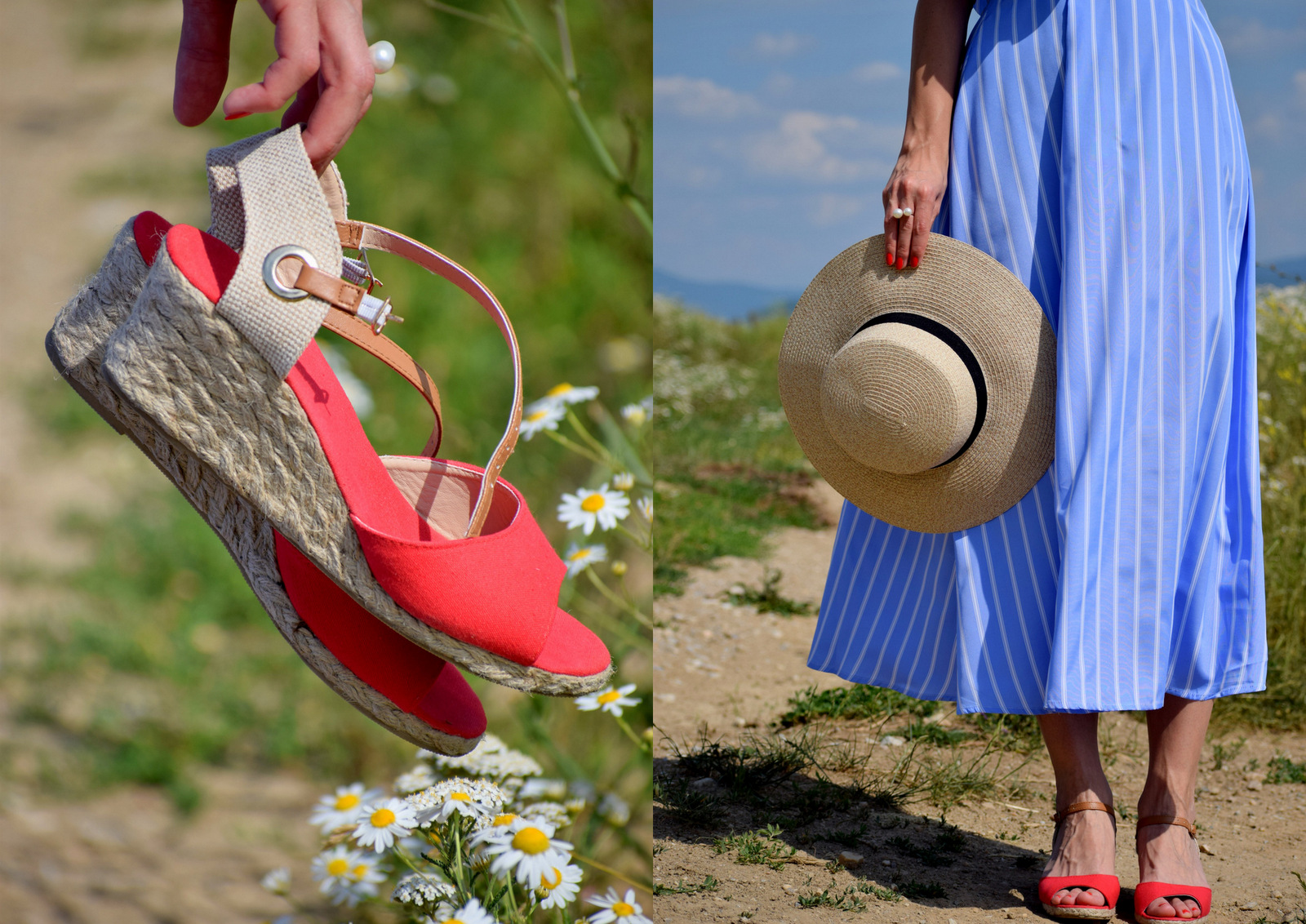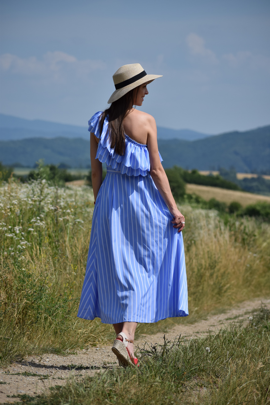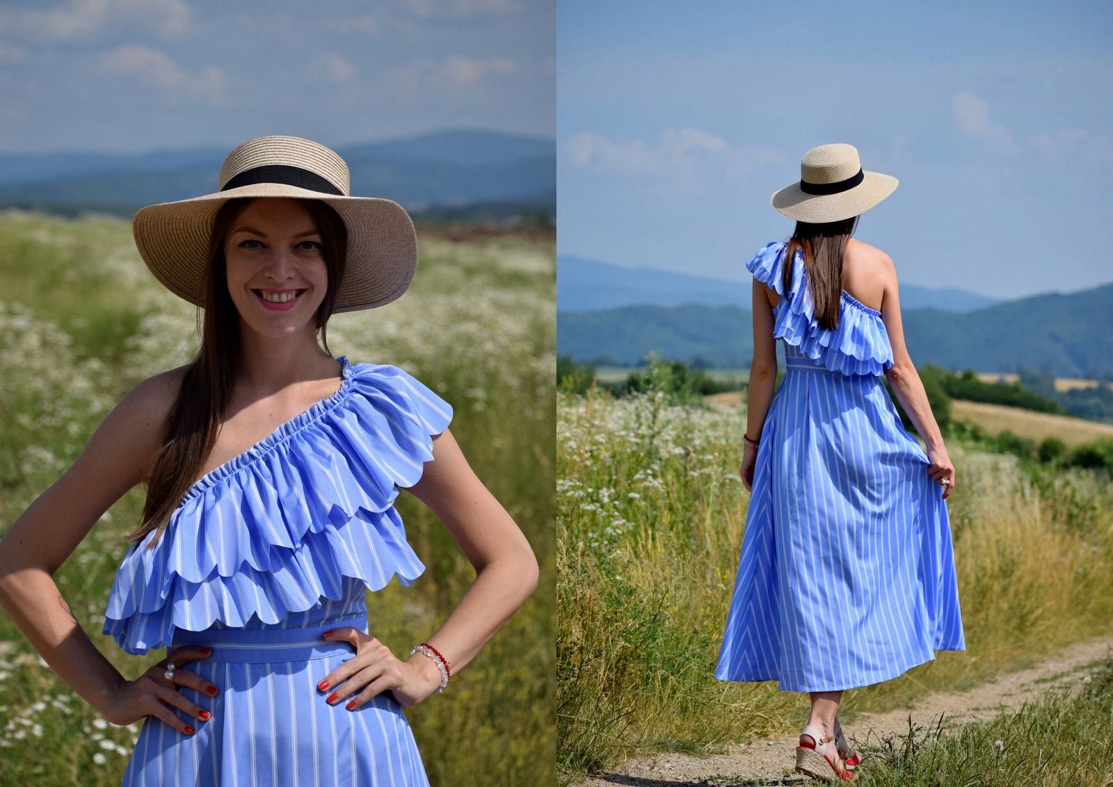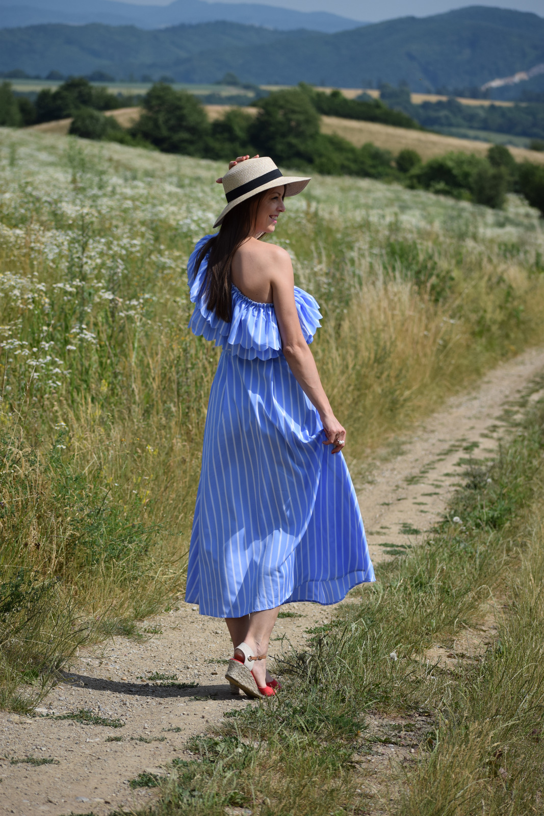 Do týchto šiat som sa zamilovala na prvý pohľad. Volán je očarujúci, aj bledomodrá farba kombinovaná s obľúbeným pásikavým vzorom. Dĺžka perfektná a naviac aj funkčné vrecká. Šaty však majú jeden, pre mňa dosť podstatný, nedostatok. Látka je bez elastánu, áno, ani volán sa na ramene nenaťahuje. Šaty mi sedia iba od pása dole a v hornej časti sú mi príšerné tesné, takmer som ani nedýchala, ale na fotkách vyzerám spokojne 😀 Materiál je fantastický, jemný a priedušný, a už teraz rozmýšľam, ako šaty prešijem. Možno z nich vznikne iba svetlomodrá sukňa a volány využijem na blúzku z inej látky, ešte si to premyslím, ale určite z nich vznikne niečo nové. Veľmi sa mi páčia dva rady volánov, ktoré sú našité aj na strane t.z. jeden rad sa ťahá na rameno a druhý pod pazuchu. To vám umožňuje šaty nosiť, v týchto horúčavách, aj bez podprsenky. Šaty som skombinovala so sandálami na plnom opätku. Sú to moje prvé takéto sandále a na moje prekvapenie ma vôbec netlačia. Objednávala som ich z e-shopu tchibo (v predajni ich nemajú) preto som bola skeptická. Nie sú však až tak pohodlné, sú tvrdé, nemajú žiadne mäkké výstelky, preto veľmi neodporúčam na celodenné nosenie.