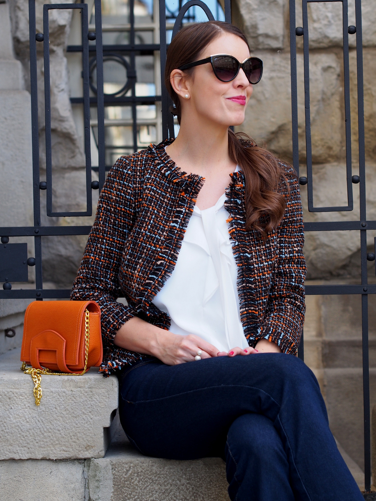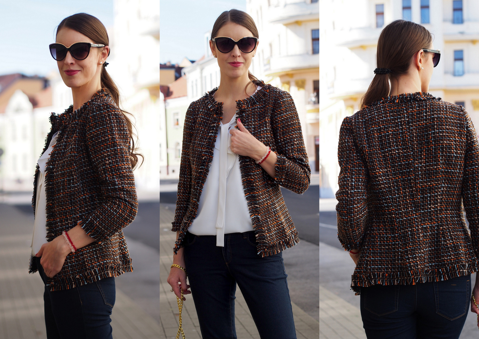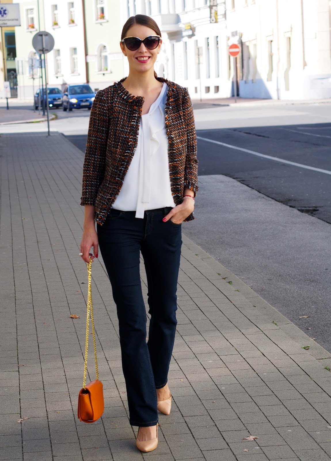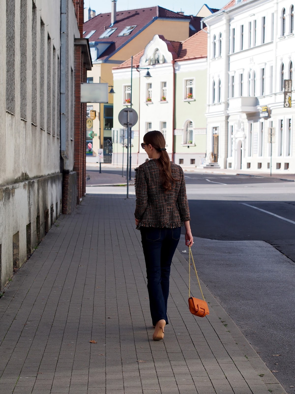 sako, blúzka: Ivana Klepáčová (kontakt & tvorba); okuliare, prsteň, spona: oriflame; kabelka: shein (odtiaľto); rifle: house; topánky: f&f