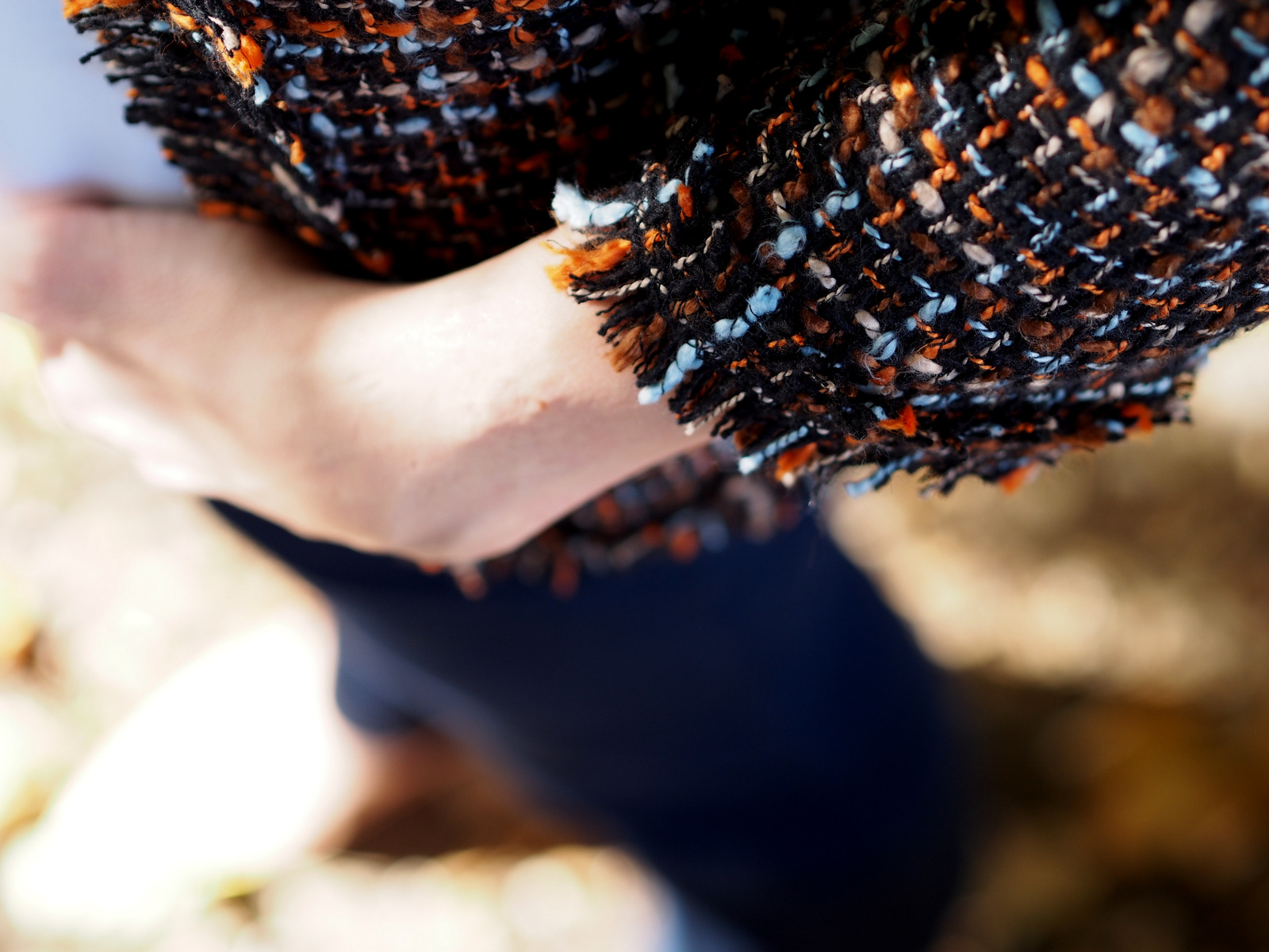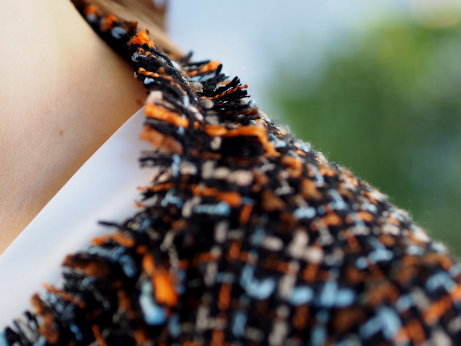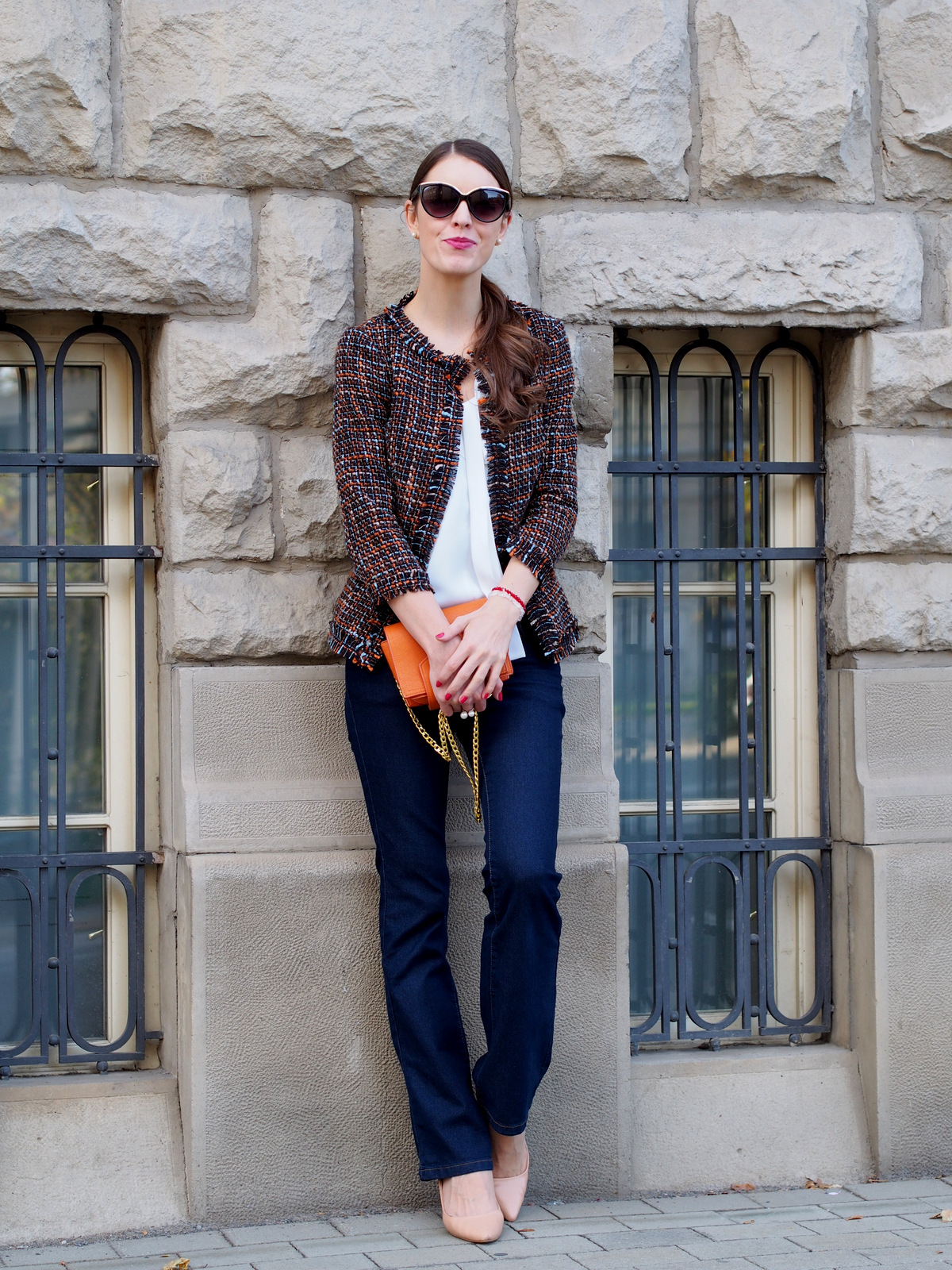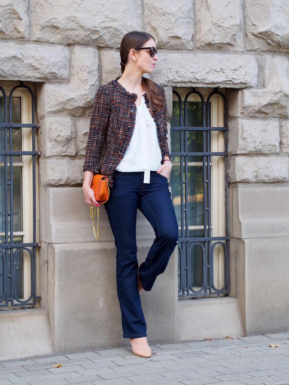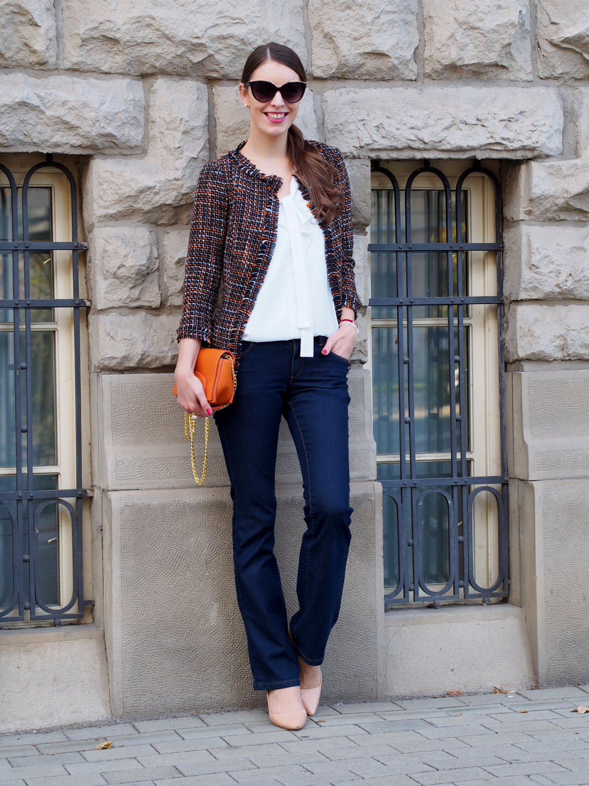 Spomínate si ako a z čoho vznikol tento blazer? Pripomeňme si to článkom “refashion / recycling: ako zo zimných šiat vzniklo trendy sako na každý deň“. Sako som si zamilovala, Je zaujímavé, vyzerá perfektne s blúzkou aj s obyčajným bielym tričkom. Krásne ozvláštni aj celočierny outfit, hodí sa k sukni, šatám aj riflom. V prvom outfite som ho skombinovala s obľúbenou bielou blúzkou s mašľou, zvonovými tmavomodrými riflami a lodičkami v telovej farbe. Doplnky tvorili perličkové náušnice a prsteň, ktoré zvýraznili elegantný blazer. Vlasy som si stiahla do copu a ozdobila som ich sponou, ktorá je aktuálne veľký hit. Zo šatníka som využila aj malú oranžovú kabelku, ktorá krásne prepojila celý outfit a dokonale ladila s oranžovou nitkou na saku 🙂 Takéto sako bez fazónky mám prvý krát a už sa teším na ďalšie variácie ako ho skombinujem do outfitu.