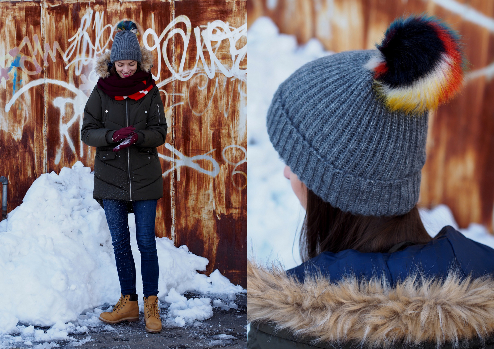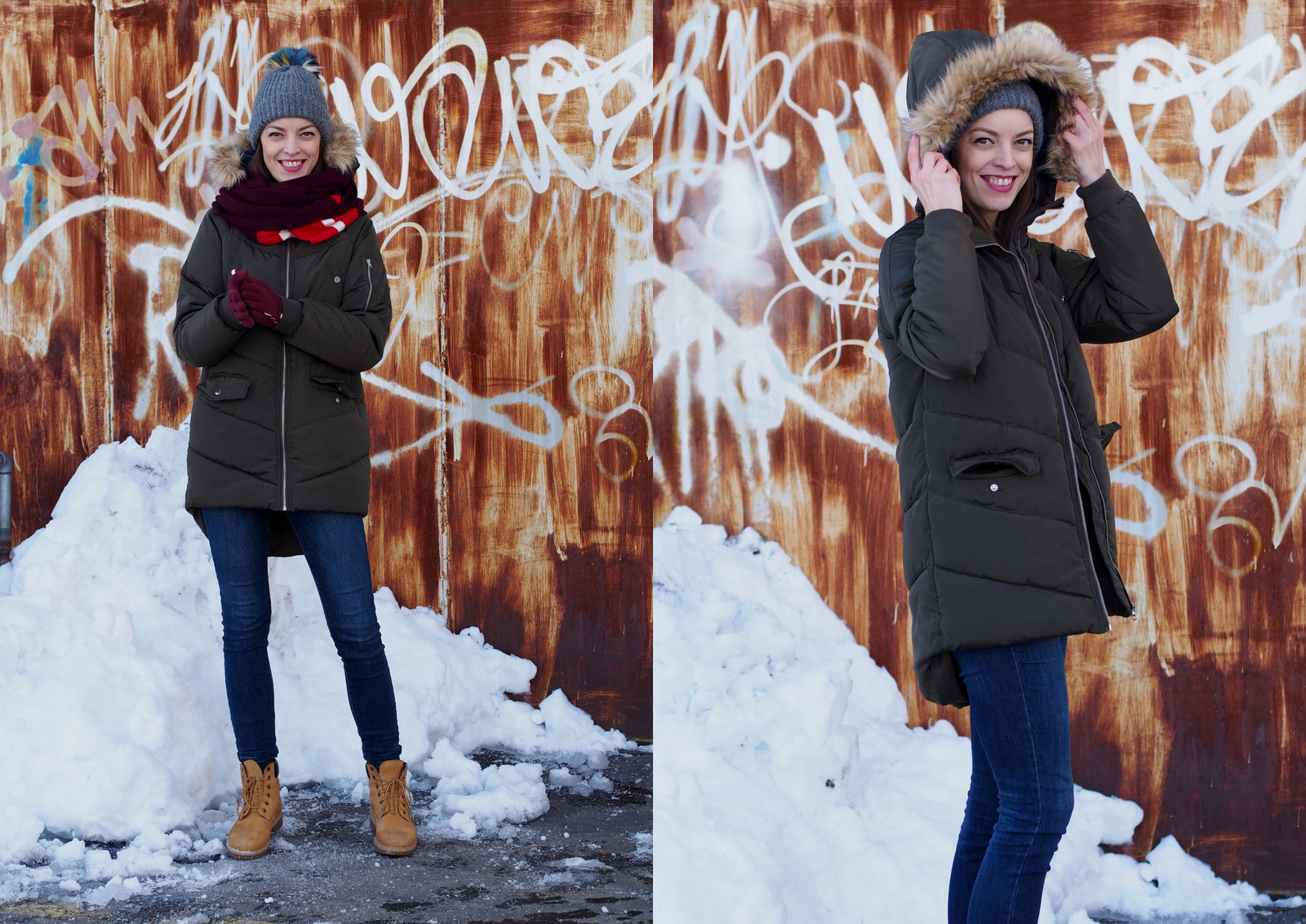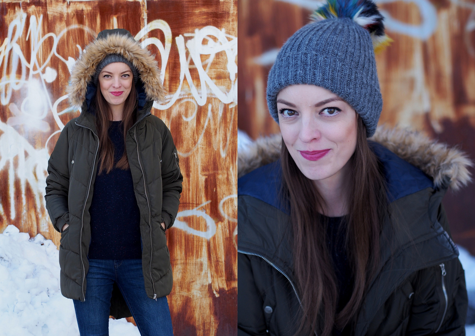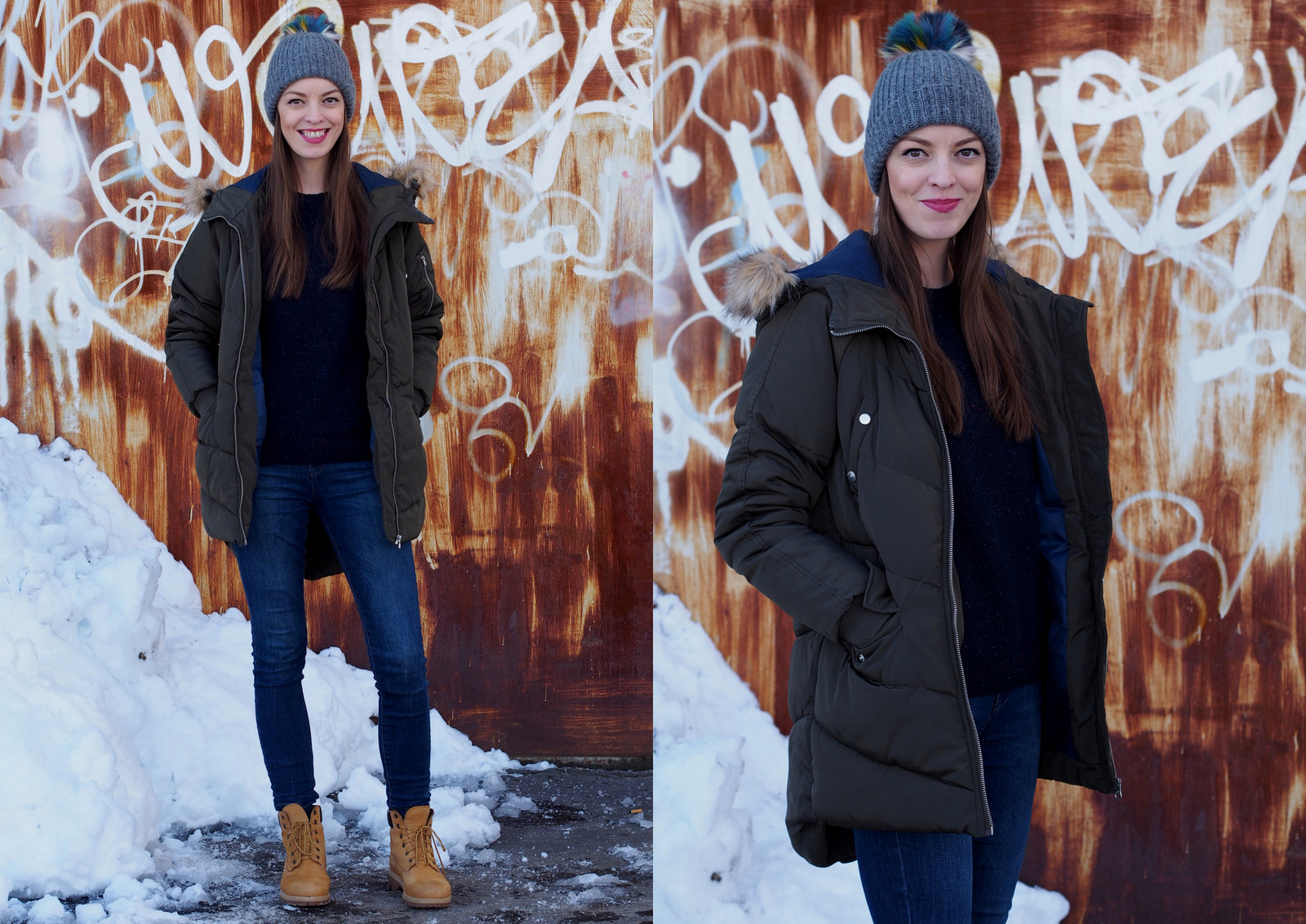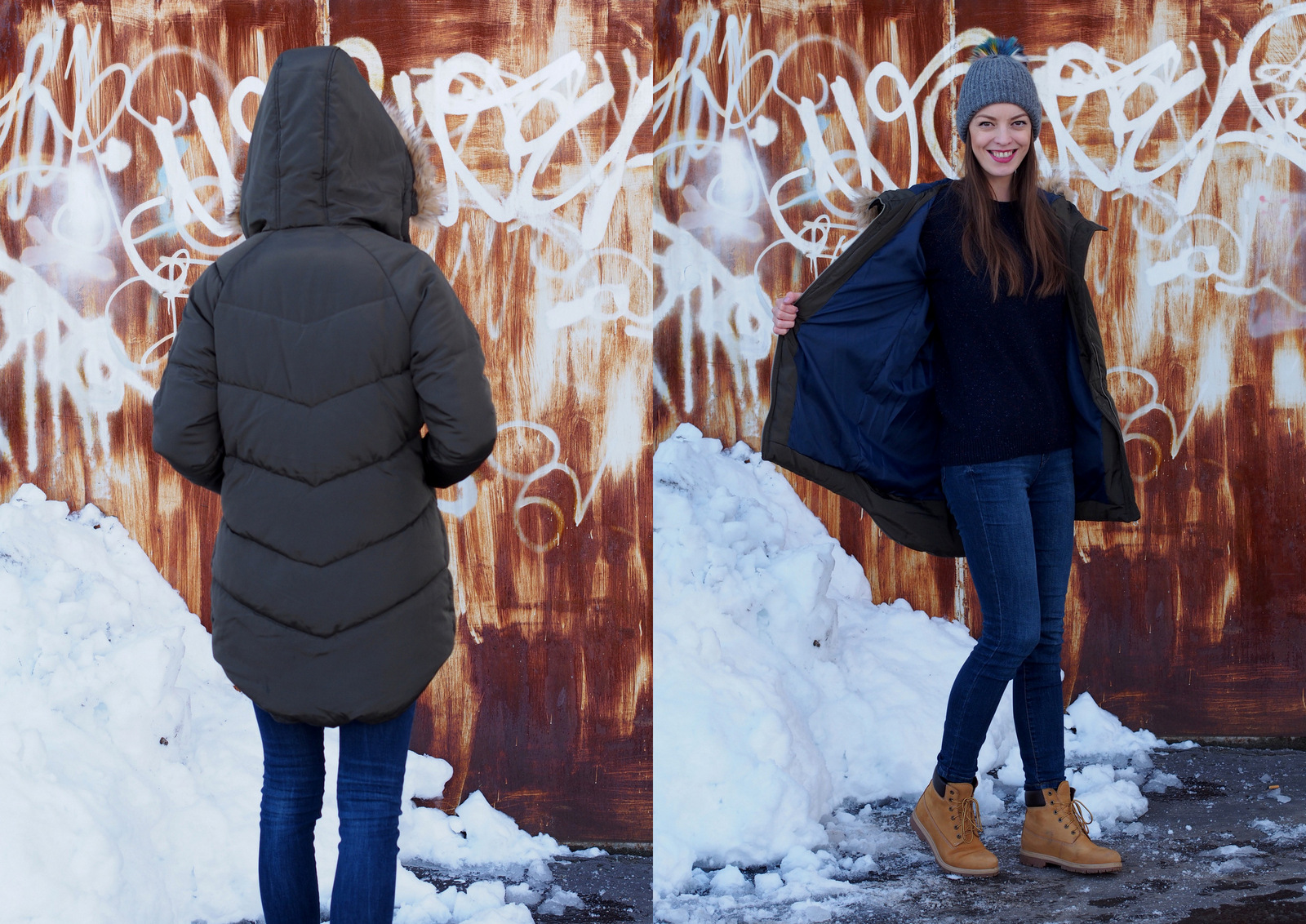 Zatúžila som po novej zimnej vetrovke. Tú moju mám už asi päť rokov a síce nie je veľmi zničená, má svoje nedostatky. Farba je vyblednutá, cvoky už nefungujú a šnúrka v páse sa strapká. Tieto detaily som však videla iba ja, normálne by si to nikto nevšimol. Zamierila som si to do obchodov House a Reserved. V obidvoch obchodoch mali nádherné vetrovky, rôznych strihov, materiálov a hrejivosti. Veľmi dlho som sa nevedela rozhodnúť, ktorú si mám kúpiť. Ak ma sledujete na instagrame, tak v instastories som vás pár krát prosila o radu. Jediné v čom som si bola istá bola farba a šušťavý materiál resp. doteraz som mala všetky látkové alebo ako by som ich opísala, ktoré jednoducho premočil aj jemný sneh alebo dážď. Opäť som siahla po zelenej farbe, ktorá mi príde veľmi univerzálna a dá sa krásne doplniť rôznymi farebnými šálami, čiapkami a rukavicami. Žltý mám kabát, čiernu som nechcela, tmavomodrú by som nenosila k riflom, ku ktorým som vetrovku potrebovala a bordovú som nenašla. Nakoniec som si vybrala v House túto prešívanú vetrovku vo vojenskej zelenej farbe. Dokonca som na ňu dostala 20% zľavu pretože to bolo v čase “čierneho piatku”, ktorý sa vo väčšine obchodov natiahol aj na víkend 🙂 Zamilovala som si strih, ktorý je vpredu kratší a vzadu dlhší, kapucňu s odnímateľnou (fake) kožušinkou a tmavomodrú podšívku. Vetrovka je neuveriteľne teplá, ako taká perina 🙂 Trošku mi vadia cvoky na prsiach, pretože sú našité na nefunkčných vreckách, normálne by som ich zakázala 😀 keď vrecká tak funkčné prosím. Inak je úplne perfektná a veľmi sa z nej teším. Vetrovku je potrebné nosiť so šálom, ale to je u mňa samozrejmosť. Do prvého outfitu som ju skombinovala s farebným šálom a šedou čiapkou s pestrofareným brmbolcom. Inak tú čiapku som si kúpila na letnej dovolenke v Nemecku za 2 eurá 🙂 Doplnila som rukavice vo farbe šálu a najpohodlnejšie a najteplejšie zimné topánky aké som kedy mala. Ešte vašu pozornosť namierim na svetrík. Ten som si kúpila v sekáči za jedno euro 🙂 Je teplučký, má jemný melír s ružovou a svetlomodrou nitkou a vyzerá ako nový. Tento outfit patrí medzi moje “záchranné” keď sa veľmi ponáhľam a nemám čas nič nové vymýšľať. Viem, že mi v ňom bude teplúčko, pohodlne a v topánkach môžem aj bez problémov utekať na autobus. Často ma môžete stretnúť aj s farebným ruksakom na chrbte. Musím si ešte zvyknúť, že kabelky sa z tohto materiálu dosť šmýkajú, takže najlepšie sú ruksaky alebo crossbody kabelky 🙂