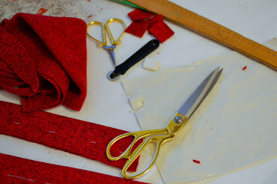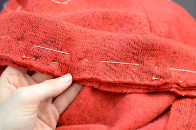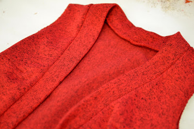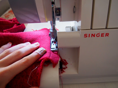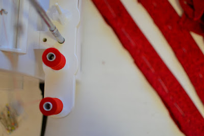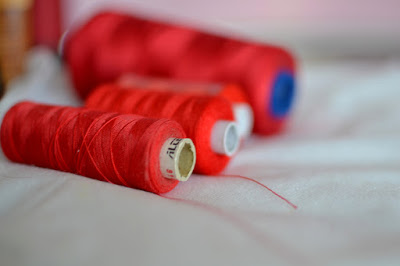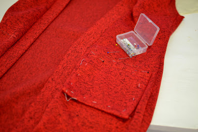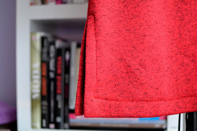 Látka má veľmi zaujímavú farbu, čo znamenalo aj vybrať správny odtieň nití, ktorými sme šili. Červená príliš žiarila, čierna bola nevhodná a bordová takisto kričala. Našťastie sme našli krásnu červenú s teplými ružovými podtónmi a farba perfektne korešpondovala s farbou látky.