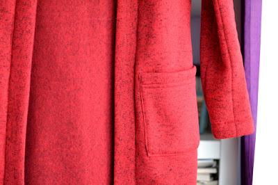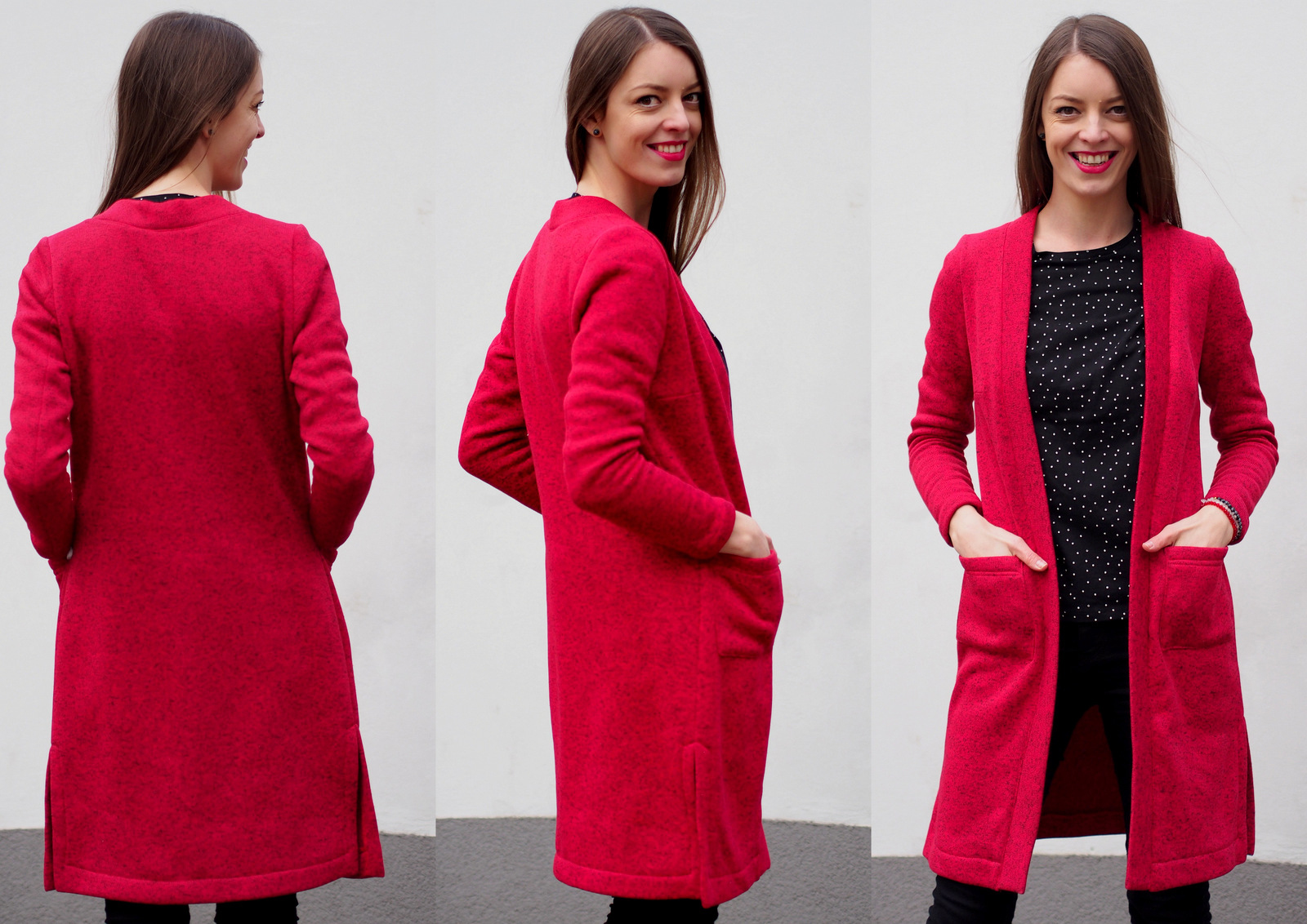Prvému vianočnému darčeku sme dali tvar 🙂 Od maminy som dostala dve látky. Jednu na šaty a druhú na kardigán. Látka na kardigán je malinovej farby s čiernym melírom a poriadne hrubá. Vymysleli sme dlhý kardigán až po kolená, s dvoma vreckami našitými navrchu a vpredu ozdobený dlhým “šálom”. Takáto látka by bola vhodná aj na mikinu alebo teplé zimné šaty. V práci však máme v zime poriadne prekúrené, a preto by som sa v takých šatách asi poriadne zapotila. Preto sme zvolili kúsok, ktorý využijem nie len v zime, ale určite aj na jeseň a jar. Vyzerá trošku aj ako kabát, veď čítajte a pozerajte ďalej 🙂