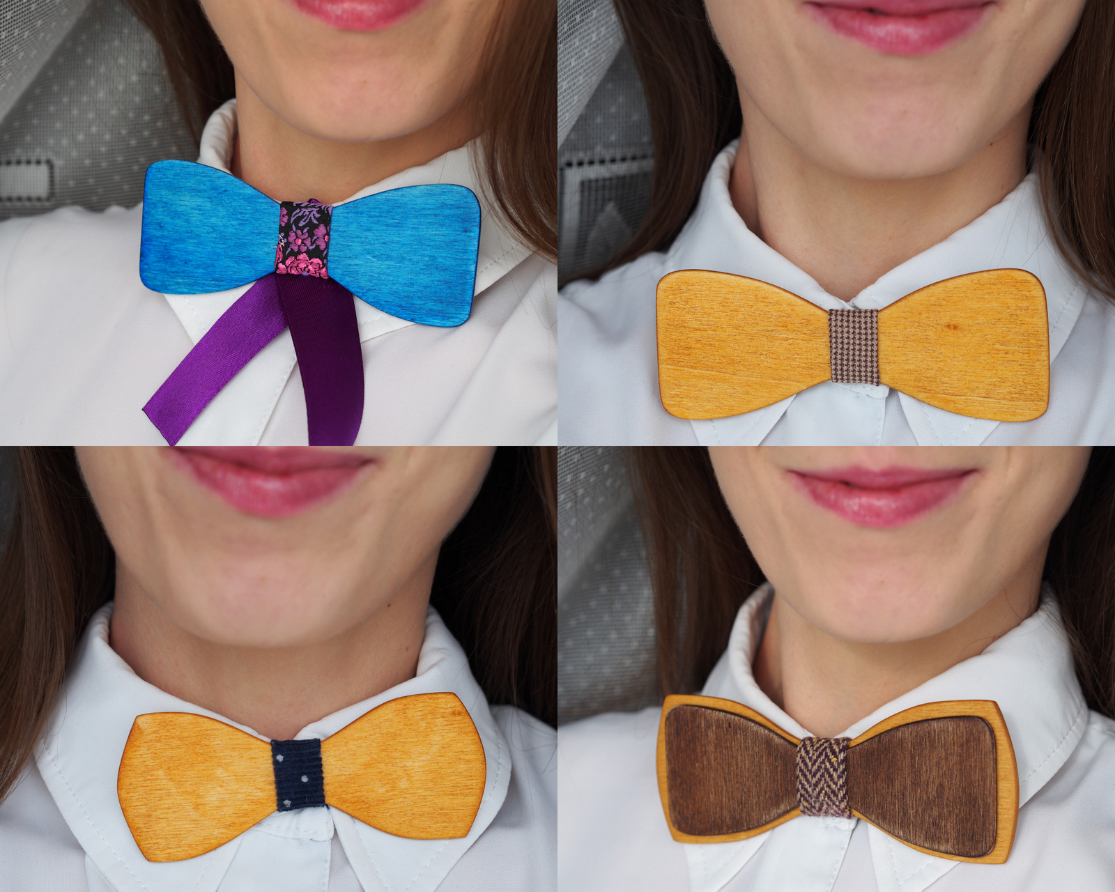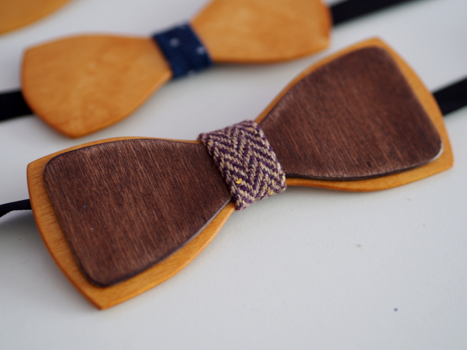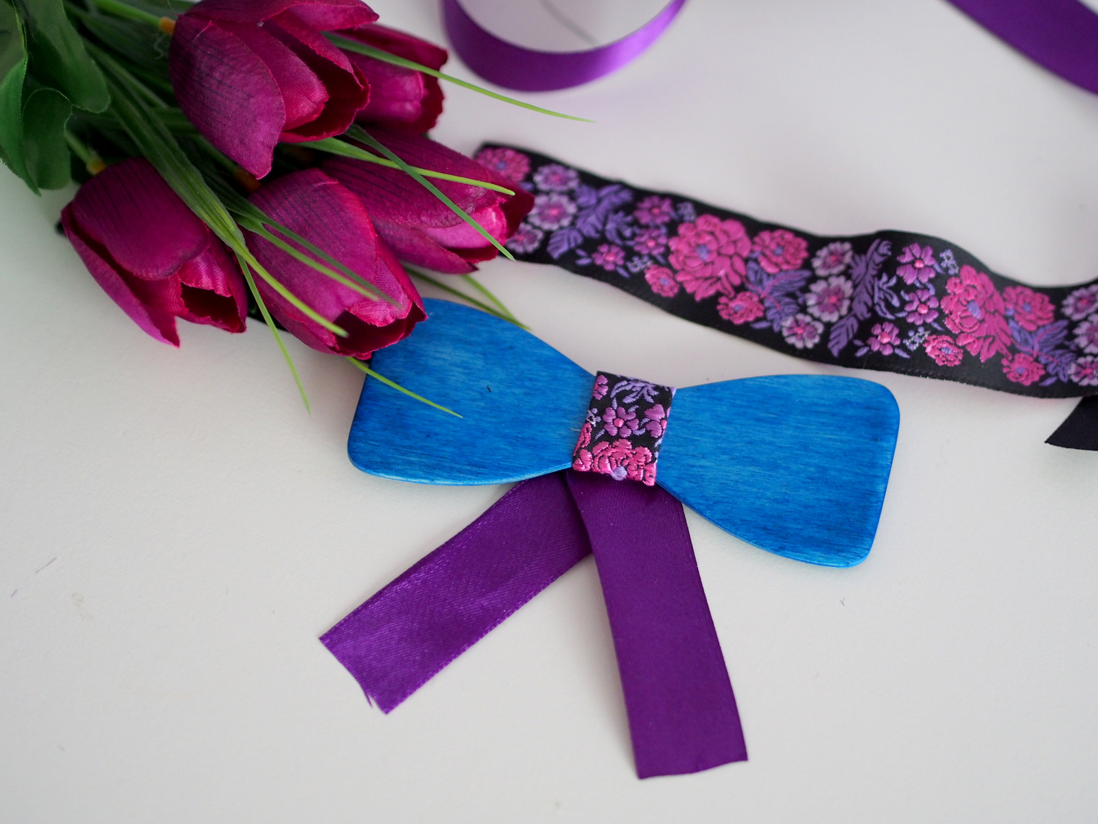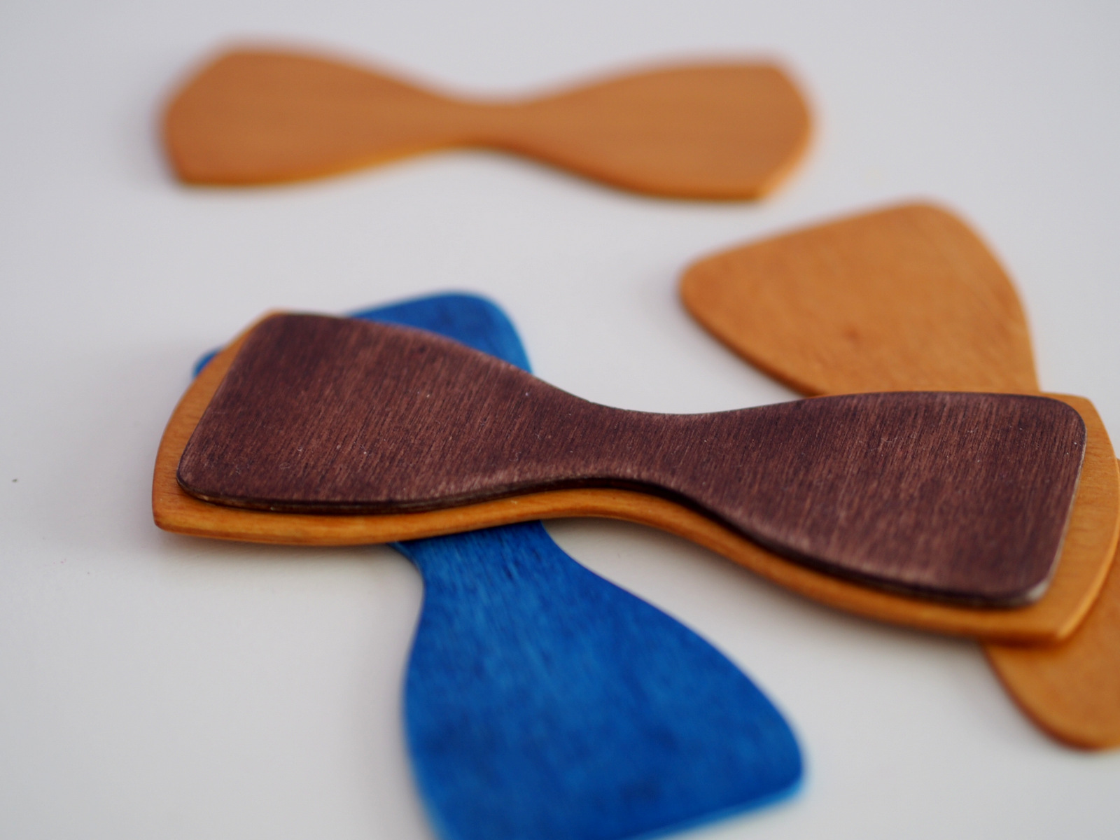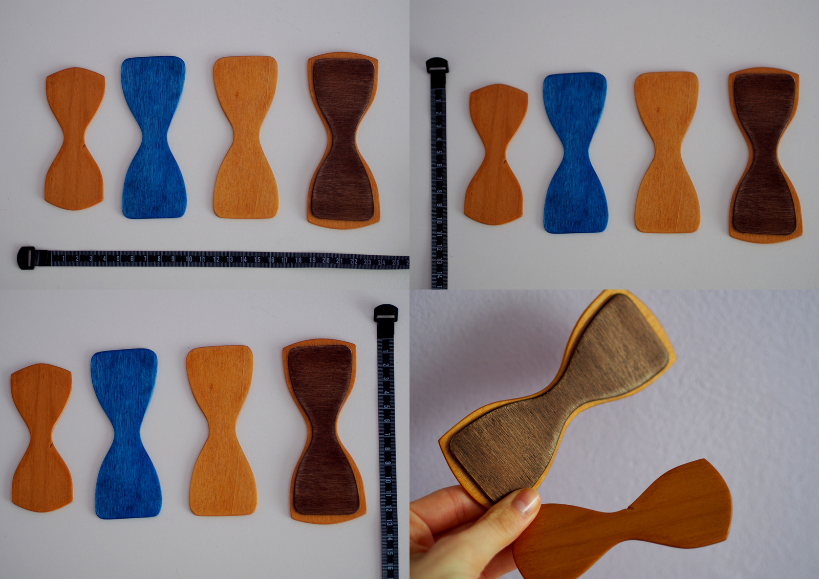 Tri sú rovnaké veľké, pre dvoch veľkých chlapov a mňa, a jeden menší, pre malého fešáka. Motýlika môžete aj nafarbiť. Stačí použiť farby na drevo alebo moridlo v tmavšom odtieni a opäť nechať poriadne zaschnúť. Modrý je nafarbený atramentom. Vilo vyrobil aj jedného dvojvrstvového motýlika 🙂 Ako? Zlepil dokopy dva motýliky lepidlom na drevo a nechal vo zveráku cez noc poriadne zaschnúť. Jeden nafarbil tmavším moridlom a vznikla krásna kontrastná kombinácia. Takto pripravené, upravené a opracované drevené motýliky som dostala následne do rúk ja. Keď som videla, čo môže vzniknúť z debničky, tak som bola rada, že sedím, inak by som asi odpadla. Krááááása, super práca. Dostala som úplne voľnú ruku a mohla som ich vyzdobiť ako som len chcela.
