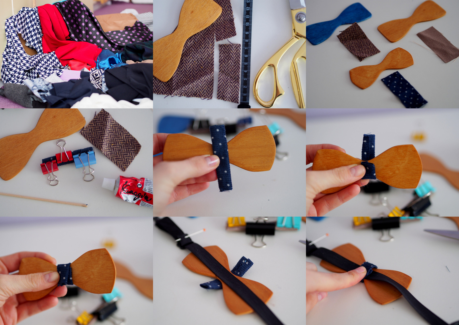 Pri výrobe textilných stredov môžete opäť použiť šijací stroj, ihlu a niť alebo lepidlo, tak ako ja. S lepidlom je to najjednoduchšie, tak načo si komplikovať život. (áno áno nie som zástancom lepidla na textil, ale v tomto prípade je to skutočne rozumnejšia cesta). Použila som milovaný kanagon. Najprv si odstirhnite kúsok látky. Šírku a dĺžku prispôsobne motýliku, ktorý ste si vyrobili. Nezabudnite, že látku budeme skladať z každej strany do stredu. Takže to bude taký obdĺžnik. Dajte do stredu trošku lepidla, rozotrite ho špajdlou alebo špáradlom a nechajte zaschnúť v klipoch, alebo štipcom na prádlo. Lepidlo schne pomerne rýchlo. Ak dáte príliš veľa lepidla, tak sa mäkký textilný pásik zmení na tvrdý a nepoddajný. Takže radšej menej lepidla. Potom ním obmotajte stred a odstrihnite prebytočné časti. Ďalej priložte zapínanie a zalepte stred v zadnej časti. Môžete zalepiť aj zapínanie, ale nemusíte. Opäť nechajte zaschnúť v klipoch.