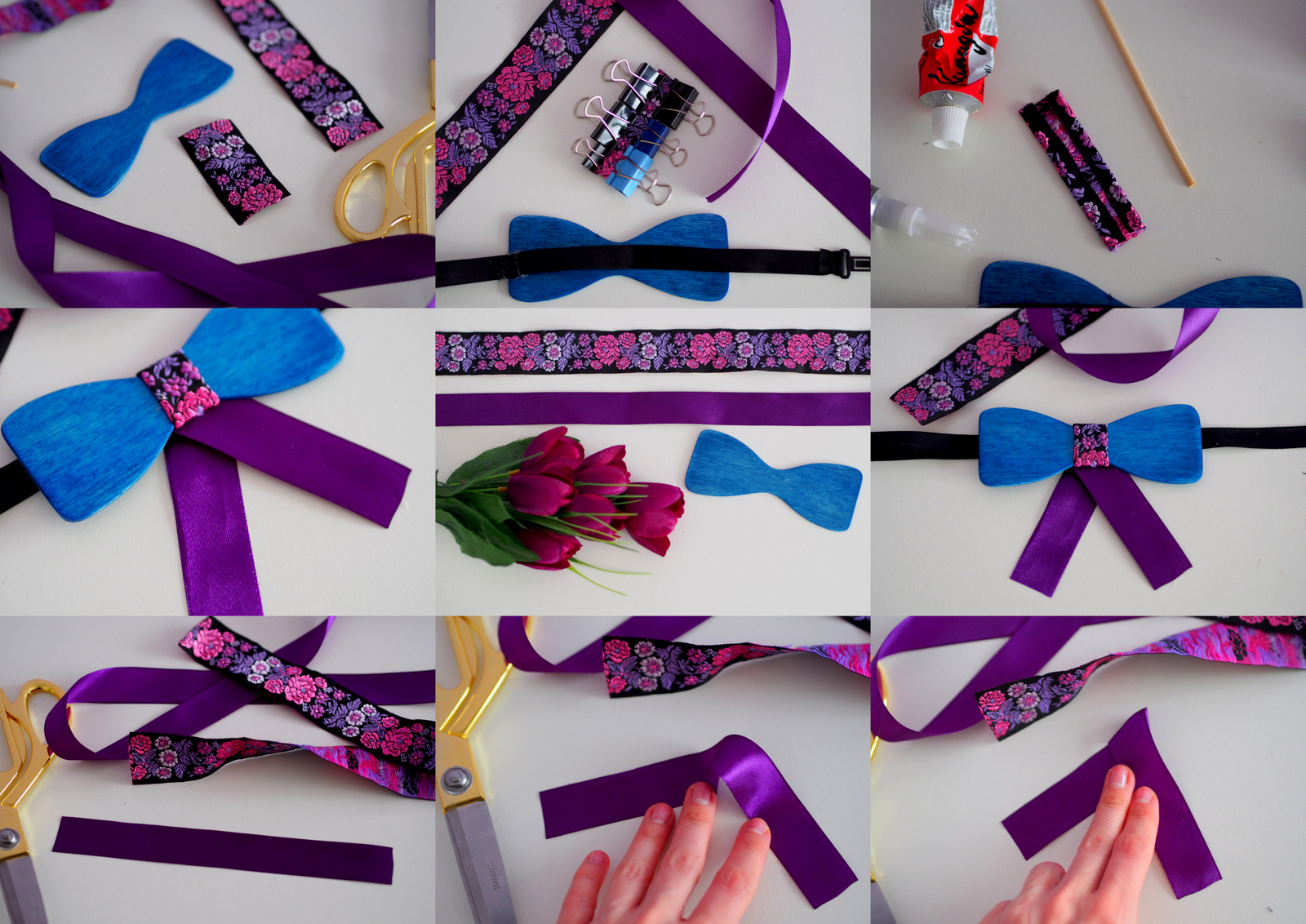 Na dámsku verziu som použila vyšívané a jednofarebné saténové stuhy. Vybrala som si farbu roka FIALOVÚ. Vyšívanú stuhu som kúpila širšiu, asi 3-4 cm opäť myslite na to, že ju musíte zohnúť, tak ako na obrázku, aby bola pekná. Opäť odporúčam pred prácou so stuhami, najprv ich opáliť, aby sa nestrapkali. Tak a postu je rovnaký. Odstrihnúť, zalepiť dokopy, vložiť zapínanie a zalepiť stred v zadnej časti. Aby bol motýlik ženský, môžete dať na spodnú časť aj takéto nožičky. Stačí odstrihnúť a takto pekne zložiť ako to vidíte dole na fotke. Potom prilepiť alebo zašiť. Ja som tento krát šila.