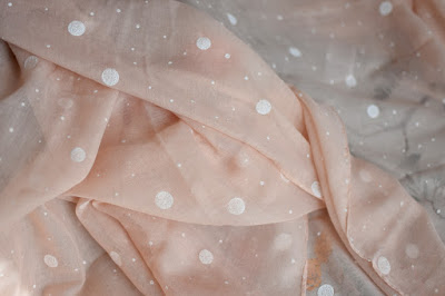 Ľahká šatka z jemného materiálu ružovkastej farby zdobená moderným bodkovaným vzorom.