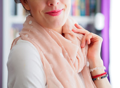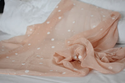 Ďalšia šatka je naopak veľmi jemná a v neutrálnej farbe. Ružová až marhuľová farba a na nej bodky v rôznych veľkostiach. Táto šatka vás aj zahreje aj keď je priesvitná. Opäť vyzerá skvele na sakách, šatách aj k jeansom. Môžete si ju zamotať okolo krku, ale aj prehodiť cez plecia ako pelerínu. Už sa teším na jar ako ju budem nosiť a striedať s tropickou, o ktorej som vám písala vyššie.