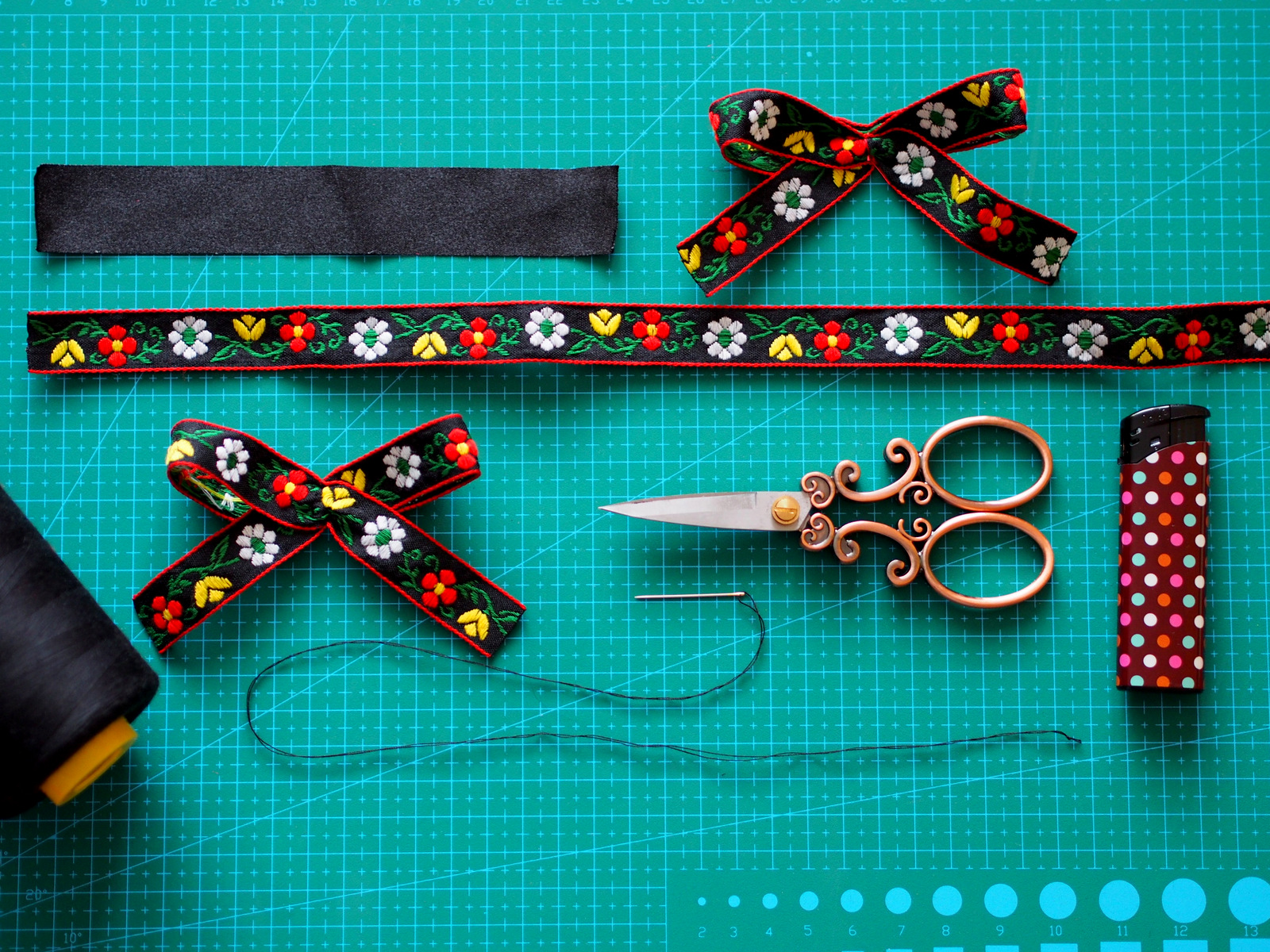 Tip: ak chcete zabezpečiť, aby sa stuhy nestrapkali, tak ich jednoducho tepelne upravte t.j. použite zapalovač. Len pozor, nenechajte sa uniesť, lebo stuha pekne horí 🙂