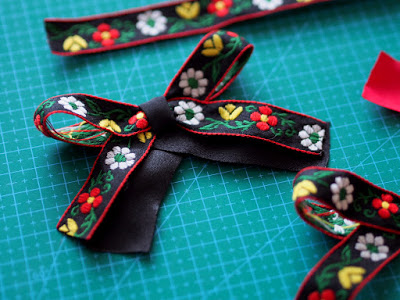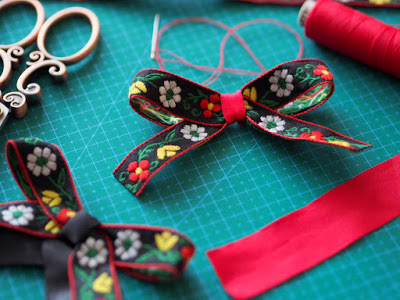Postup je veľmi jednoduchý. Najprv si z vyšívanej stuhy urobíme mašľu. Je len na vás či bude veľká, malá, dvojitá alebo v jedno. Potom mašľu dokopy zošijeme aby držala tvar. Tento krok môžete preskočiť a utiahnuť ju iba strednou stuhou, ale odporúčam zošiť ju aspoň dvoma – troma stehmi, aby sa vám s ňou ďalej lepšie pracovalo a hlavne aby sa nosením (časom) nerozpadla. Potom si urobte pekný stred a nakoniec vytvorte z inej stuhy “nožičky” a takisto ich prišite na rub. Voilá a stuha je na svete. Podrobný postup TU.