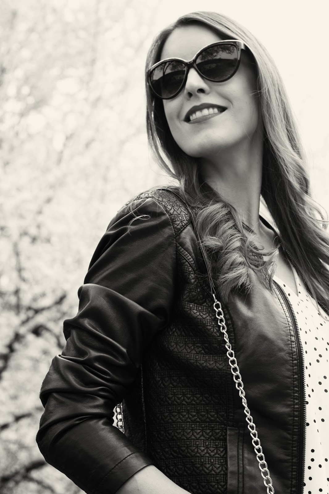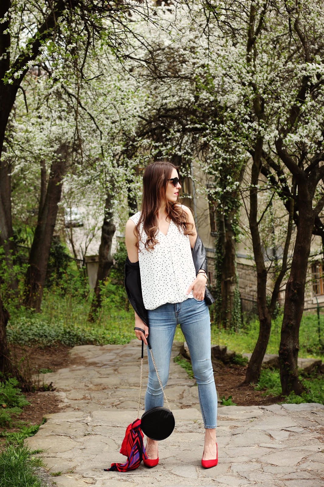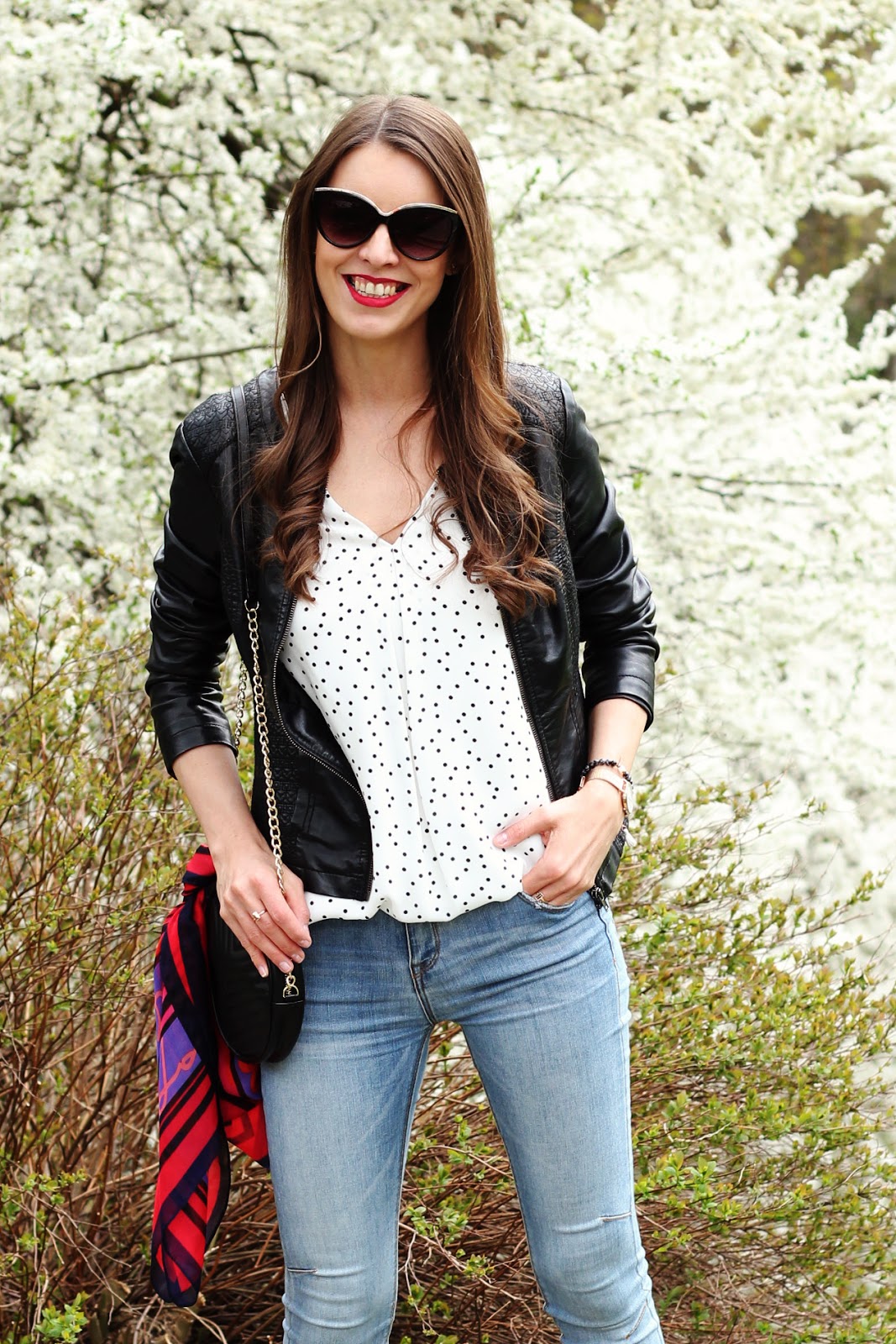 Medzi trendy, v ktorých zažiarite toto leto, patria bodky. Šik budete v topoch, sukniach, blúzkach aj šatách. Módny návrhári tento krát vybrali nesmrteľnú čierno-bielu kombináciu, ktorá zaplavila móla aj kamenné obchody s bežnou konfekciou. Môžete experimentovať s veľkosťami bodiek a ak vám nechýba odvaha, tak bodky kombinujte. Investovať môžete napríklad do bielej blúzky s malinkými čiernymi bodkami a čiernej midi sukňu s veľkými bielymi bodkami. Môžete ich kombinovať do jedného outfitu, kedy budú na prvý pohľad vyzerať ako trendy zaujímavé šaty a len vy budete vedieť, že ide o dva kúsky, ktoré si pozajtra nakombinujete úplne inak 😉 Bodkovanému topu som neodolala ani ja. Je dlhý pod zadok, z úžasného padavého materiálu a s véčkovým výstrihom, ktorý ja až tak často nenosím. V prvom outfite som ho zastrčila do nohavíc a doplnila červené lodičky, kruhovú kabelku, ktorá je takisto veľký hit, a aby mi ráno nebolo chladno, tak aj koženkovú bundu. Bez slnečných okuliarov v týchto dňoch nevychádzam z domu a šatku mám väčšinou ráno na krku a poobede prevesenú na kabelke. Máte bodky vo svojom šatníku? Páči sa vám tento vzor alebo sa mu skôr vyhýbate?