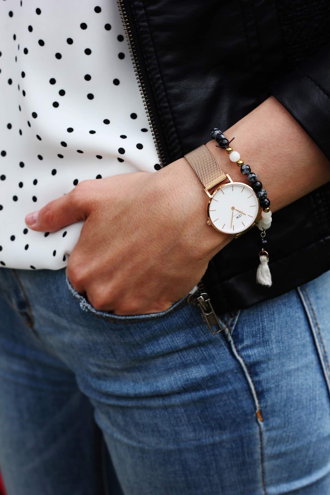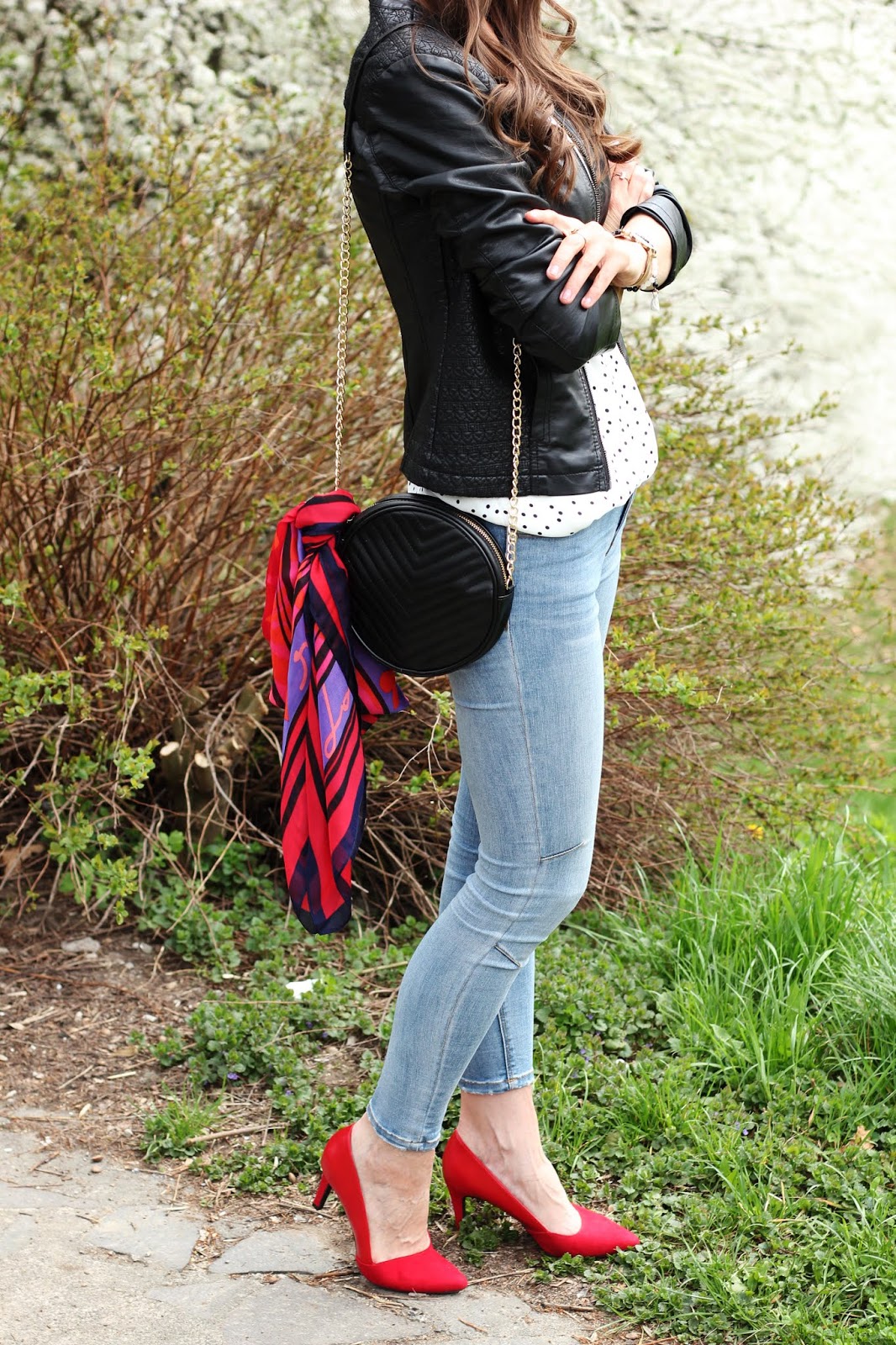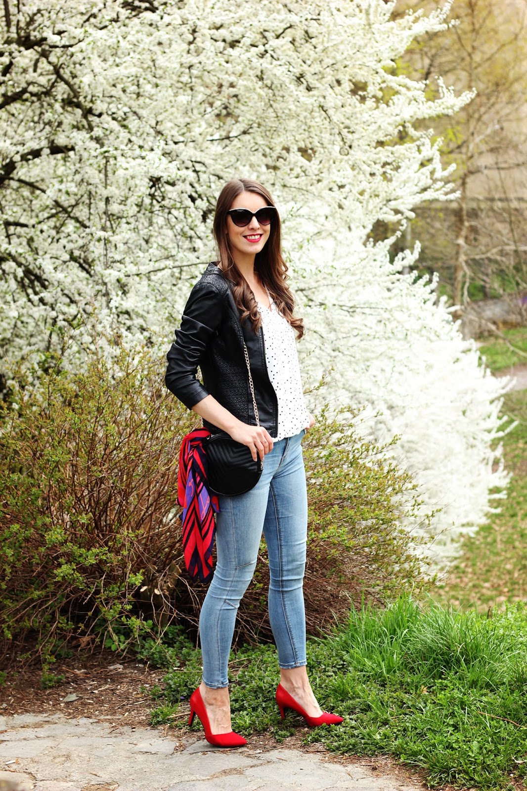 Medzi trendy, v ktorých zažiarite toto leto, patria bodky. Šik budete v topoch, sukniach, blúzkach aj šatách. Módny návrhári tento krát vybrali nesmrteľnú čierno-bielu kombináciu, ktorá zaplavila móla aj kamenné obchody s bežnou konfekciou. Môžete experimentovať s veľkosťami bodiek a ak vám nechýba odvaha, tak bodky kombinujte. Investovať môžete napríklad do bielej blúzky s malinkými čiernymi bodkami a čiernej midi sukňu s veľkými bielymi bodkami. Môžete ich kombinovať do jedného outfitu, kedy budú na prvý pohľad vyzerať ako trendy zaujímavé šaty a len vy budete vedieť, že ide o dva kúsky, ktoré si pozajtra nakombinujete úplne inak 😉 Bodkovanému topu som neodolala ani ja. Je dlhý pod zadok, z úžasného padavého materiálu a s véčkovým výstrihom, ktorý ja až tak často nenosím. V prvom outfite som ho zastrčila do nohavíc a doplnila červené lodičky, kruhovú kabelku, ktorá je takisto veľký hit, a aby mi ráno nebolo chladno, tak aj koženkovú bundu. Bez slnečných okuliarov v týchto dňoch nevychádzam z domu a šatku mám väčšinou ráno na krku a poobede prevesenú na kabelke. Máte bodky vo svojom šatníku? Páči sa vám tento vzor alebo sa mu skôr vyhýbate?