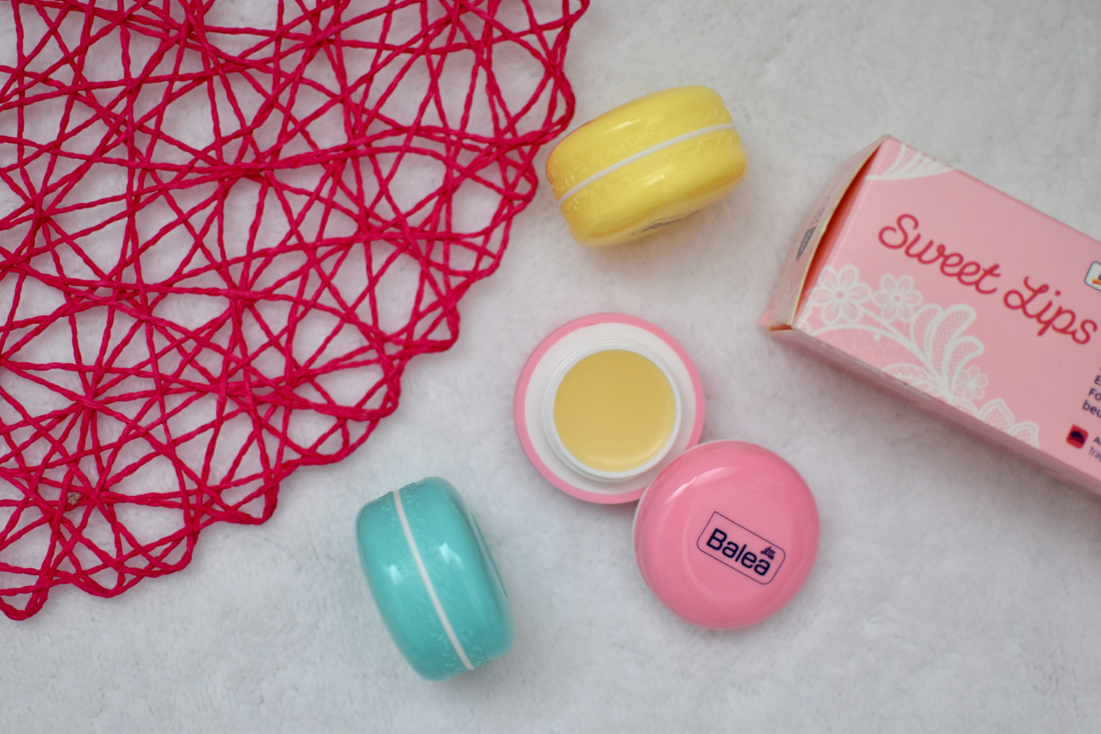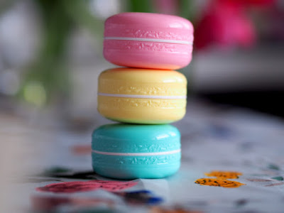 Tri balzamy, ktoré vyzerajú ako makrónky, mňam 🙂 Ružový má vôňu jahody, žltý vanilky a modro-zelený kokosu. Všetky tri voňajú náááádherneee, jahoda by mohla byť trooošku výraznejšia ale cítiť ju tam. Veľmi ale veľmi sa mi páči balenie. Je skutočne malinké a praktické do kabelky aj do vrecka nohavíc. Úplne som si ich zamilovala. Môžete ich niekomu darovať všetky naraz, tak sú krásne zabalené, alebo ich môžete darovať až trom kamarátkam. Maslo je úplne skvelé a má blahodárne účinky na pery. Mňamka