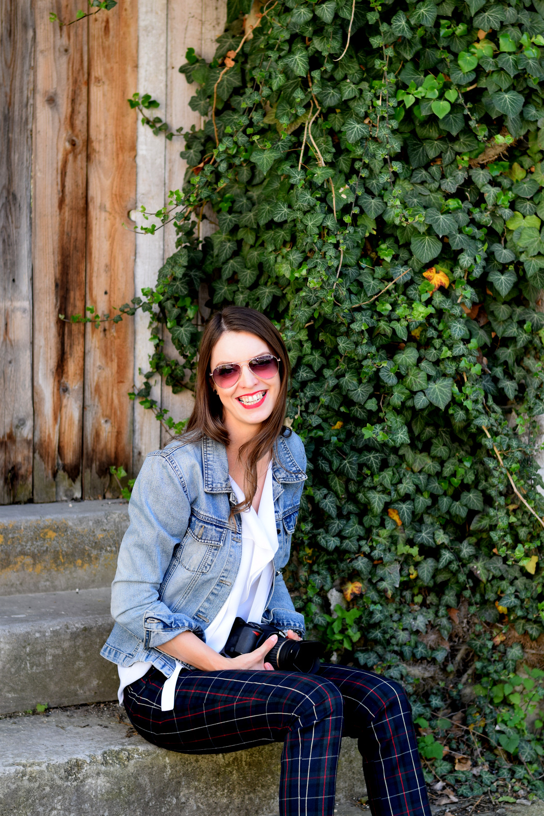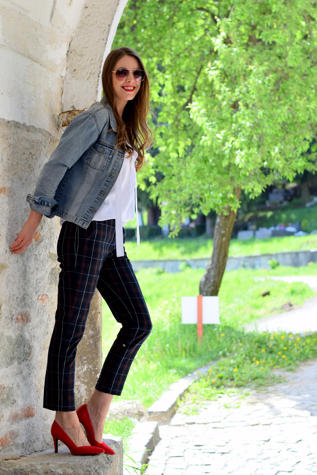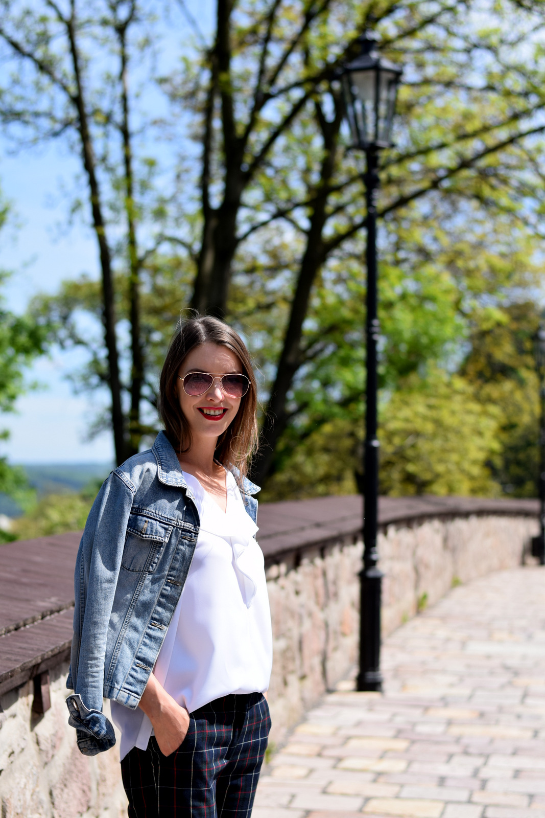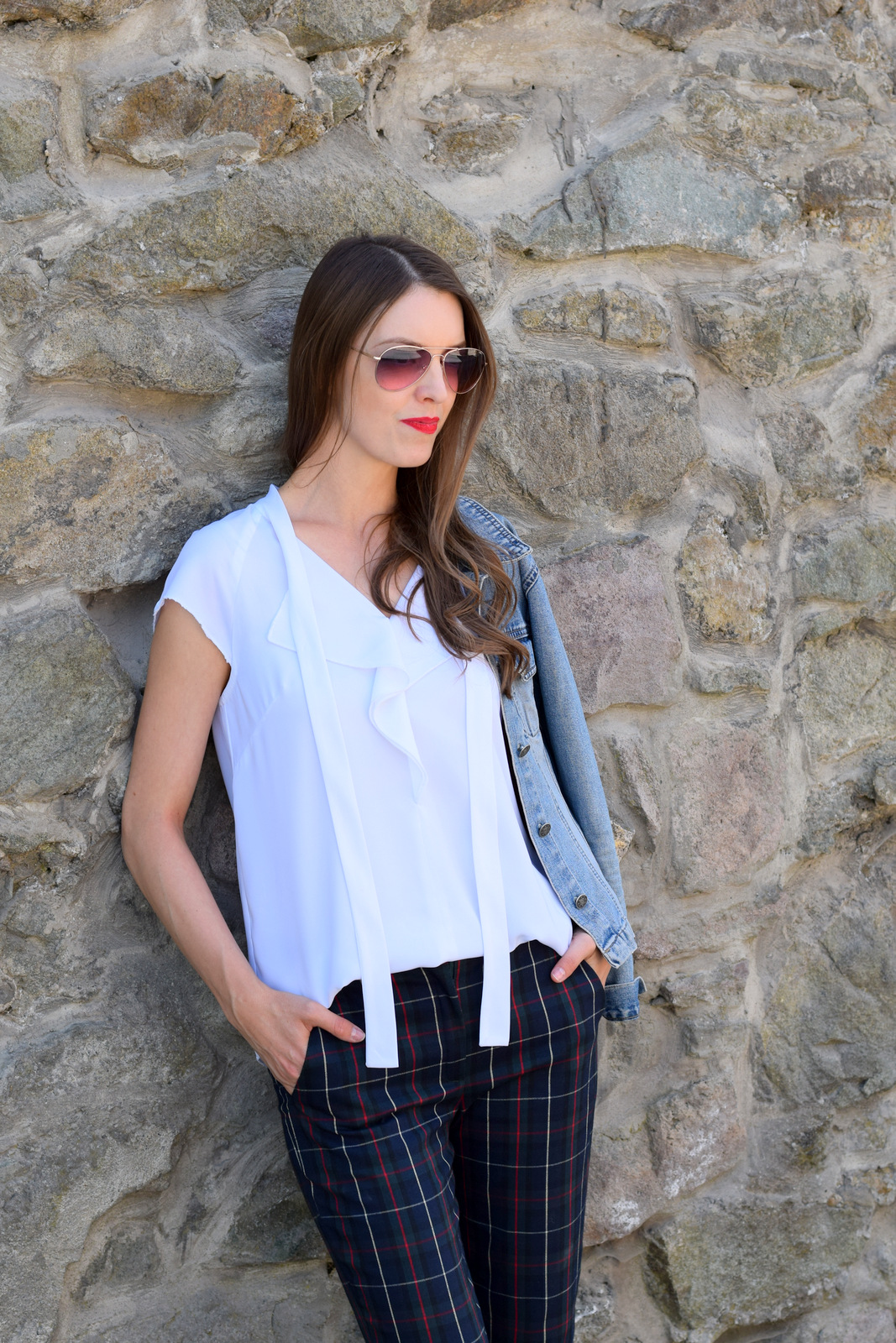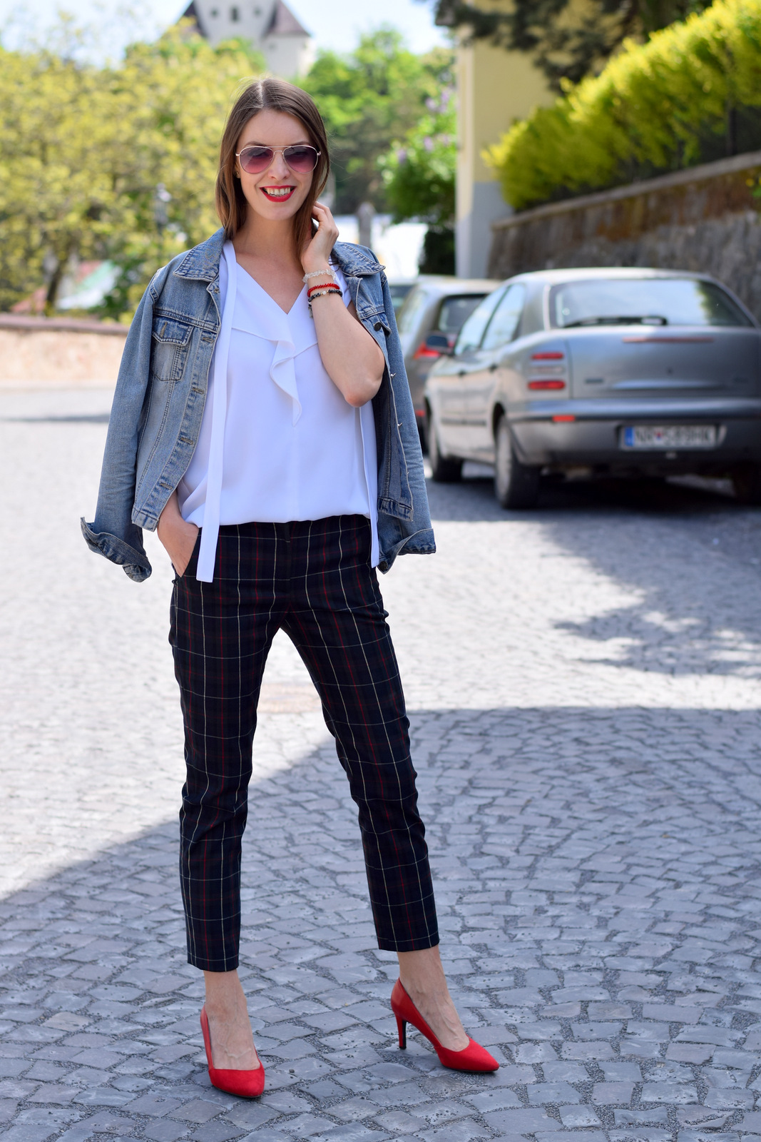 nohavice, blúzka: Klepáčová (tvorba & kontakt); lodičky: camaieu; riflová bunda: secondhand; okuliare: oriflame