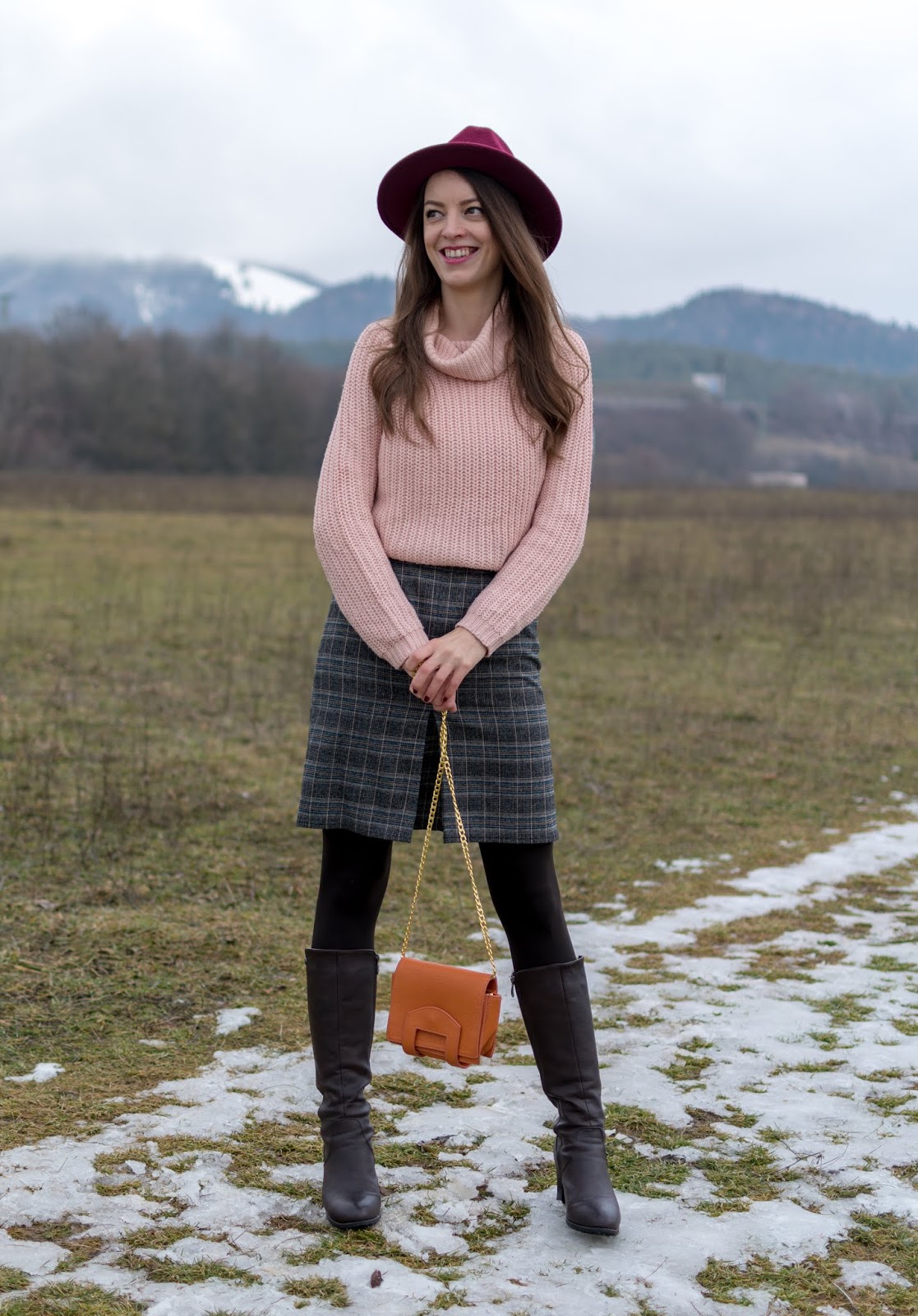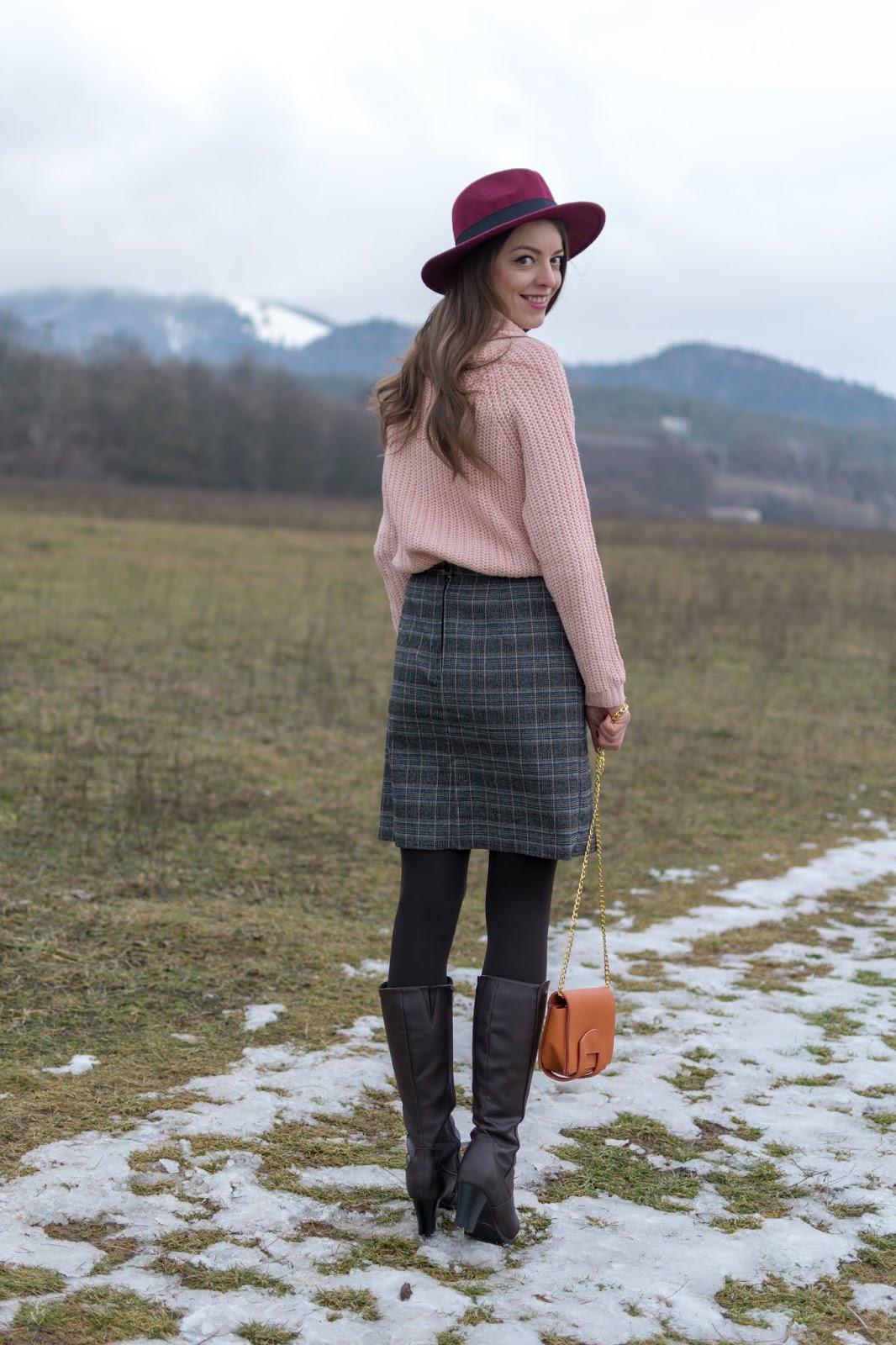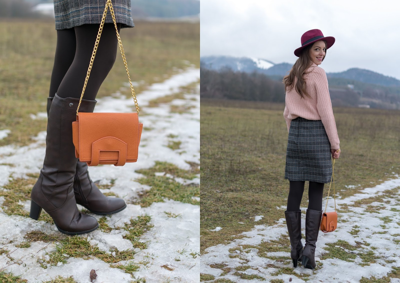 Takéto sukne nenosím. Všetky moje sukne sú buď dlhé plisované alebo v dĺžke nad kolená naberané alebo skladané. Bol to však jediný model, na ktorý mama vedela ušetriť z látky, z ktorej vznikli tieto nohavice. Sukne však v zime môžu byť kľudne aj kratšie, ako nosím štandardne, pretože pod ne nosím hrubé pančuchy. Táto sukňa je úžasná. Vďaka materiálu a rozparku vpredu, je sukňa maximálne pohodlná. Perfektne sa kombinuje s hrubými, ale aj s tenšími pančuchami. Dá sa nosiť s jednoduchým tričkom čiernej alebo bielej farby, no najradšej ju nosím s rifľovou košeľou. Topánky sa k sukni takisto dajú rôzne kombinovať. V kancelárii lodičky aj baleríny a v exteriéri čižmy pod kolená, ale aj nízke topánky. Do tohto outfitu som ju skombinovala s tmavohnedými pančuchami, čižmami na malom opätku a hrubým svetloružovým rolákom. Doplnky tvorí bordový klobúk a oranžová malá kabelka na retiazke. Nakoniec som rada, že som pristúpila aj na takýto strih sukne, pretože je super a trošku mi rozšírila možnosti :).