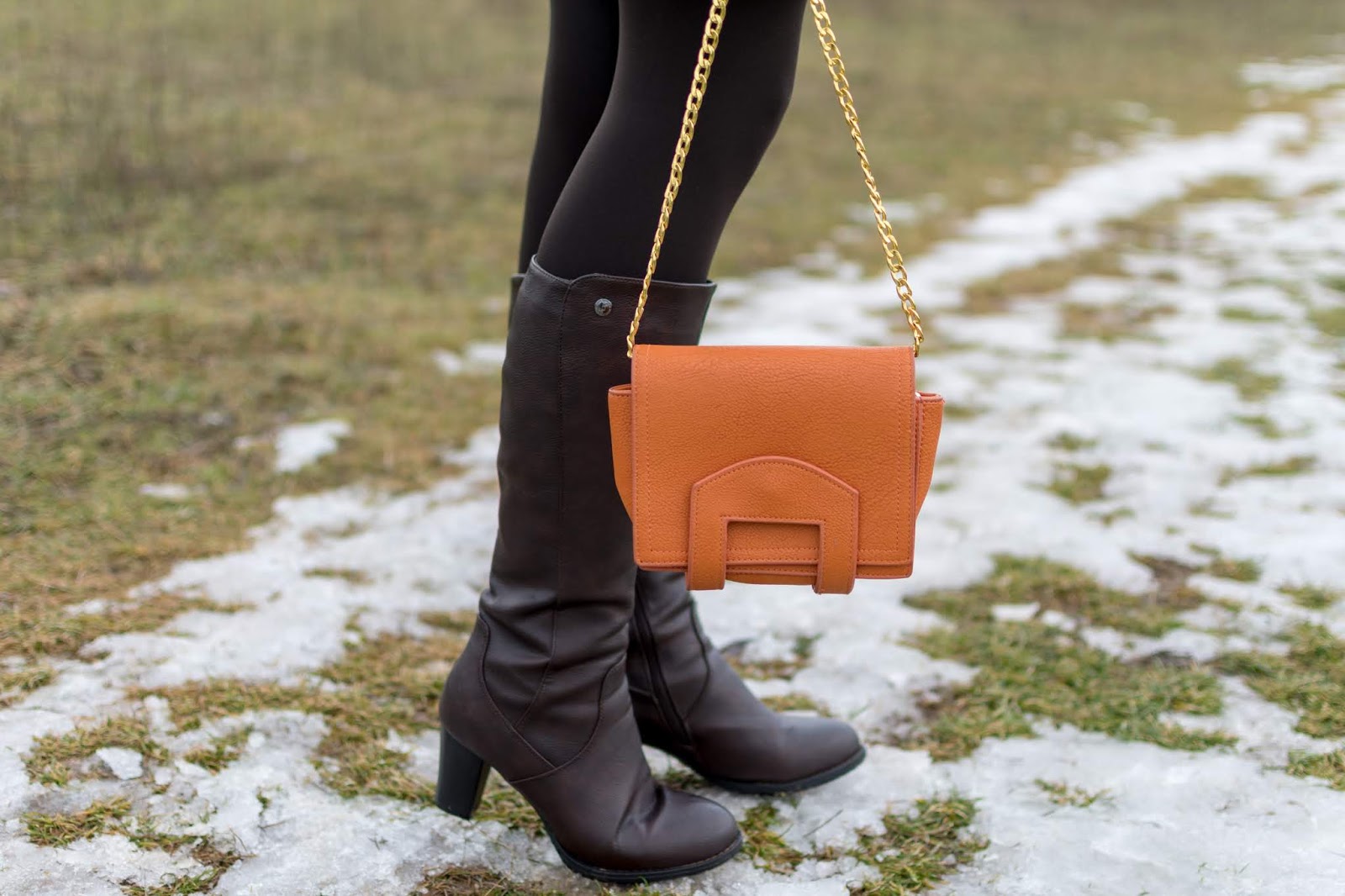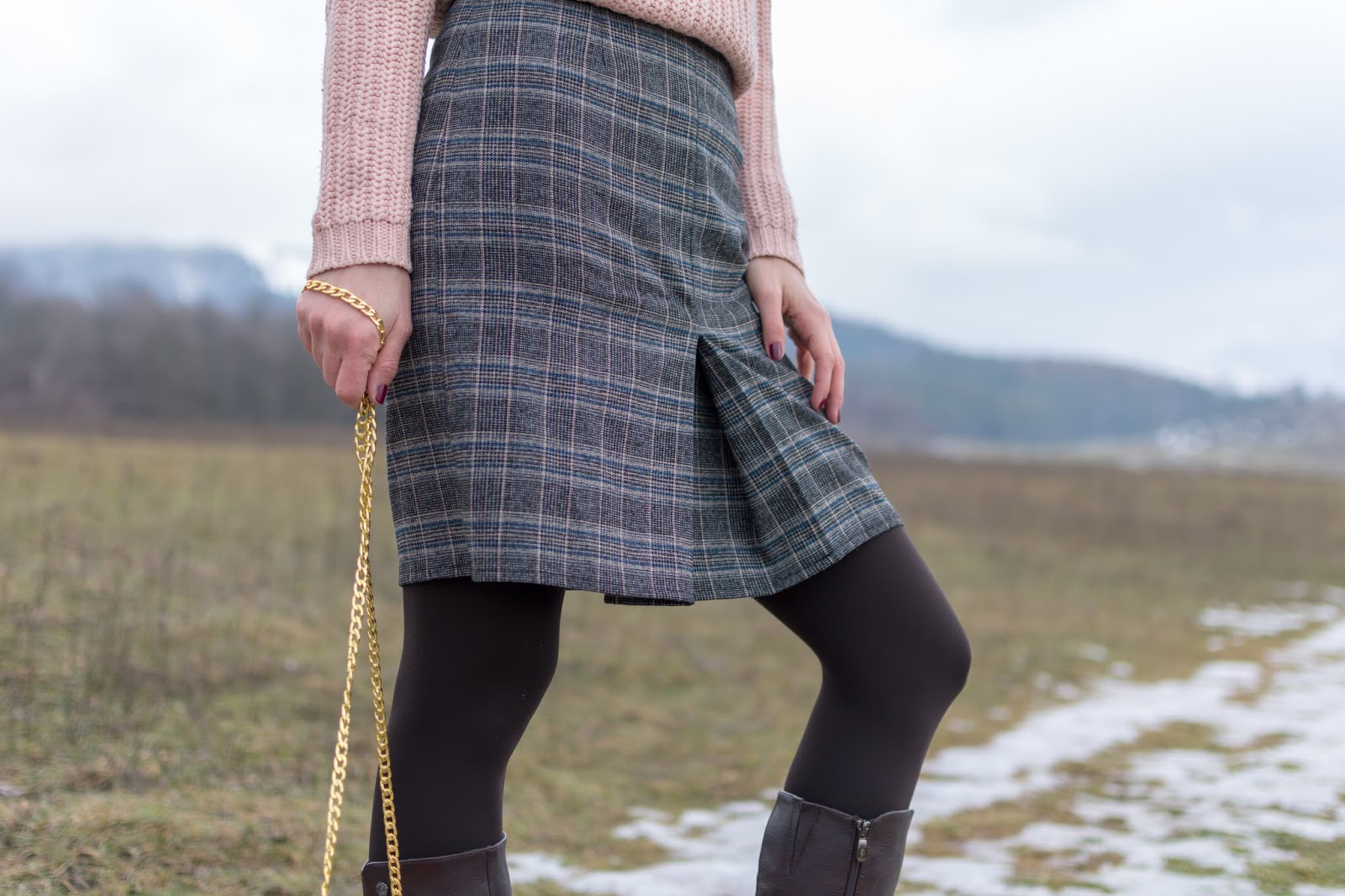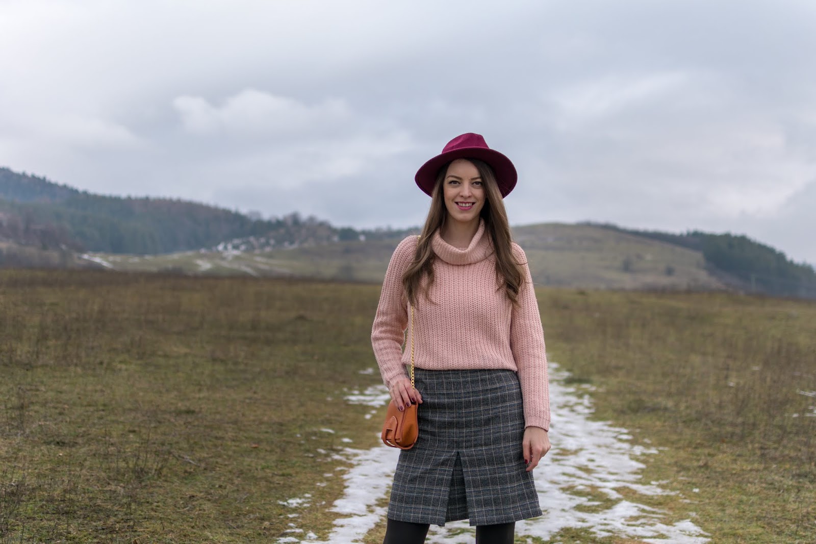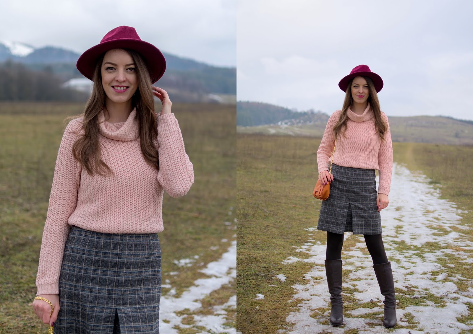 Takéto sukne nenosím. Všetky moje sukne sú buď dlhé plisované alebo v dĺžke nad kolená naberané alebo skladané. Bol to však jediný model, na ktorý mama vedela ušetriť z látky, z ktorej vznikli tieto nohavice. Sukne však v zime môžu byť kľudne aj kratšie, ako nosím štandardne, pretože pod ne nosím hrubé pančuchy. Táto sukňa je úžasná. Vďaka materiálu a rozparku vpredu, je sukňa maximálne pohodlná. Perfektne sa kombinuje s hrubými, ale aj s tenšími pančuchami. Dá sa nosiť s jednoduchým tričkom čiernej alebo bielej farby, no najradšej ju nosím s rifľovou košeľou. Topánky sa k sukni takisto dajú rôzne kombinovať. V kancelárii lodičky aj baleríny a v exteriéri čižmy pod kolená, ale aj nízke topánky. Do tohto outfitu som ju skombinovala s tmavohnedými pančuchami, čižmami na malom opätku a hrubým svetloružovým rolákom. Doplnky tvorí bordový klobúk a oranžová malá kabelka na retiazke. Nakoniec som rada, že som pristúpila aj na takýto strih sukne, pretože je super a trošku mi rozšírila možnosti :).