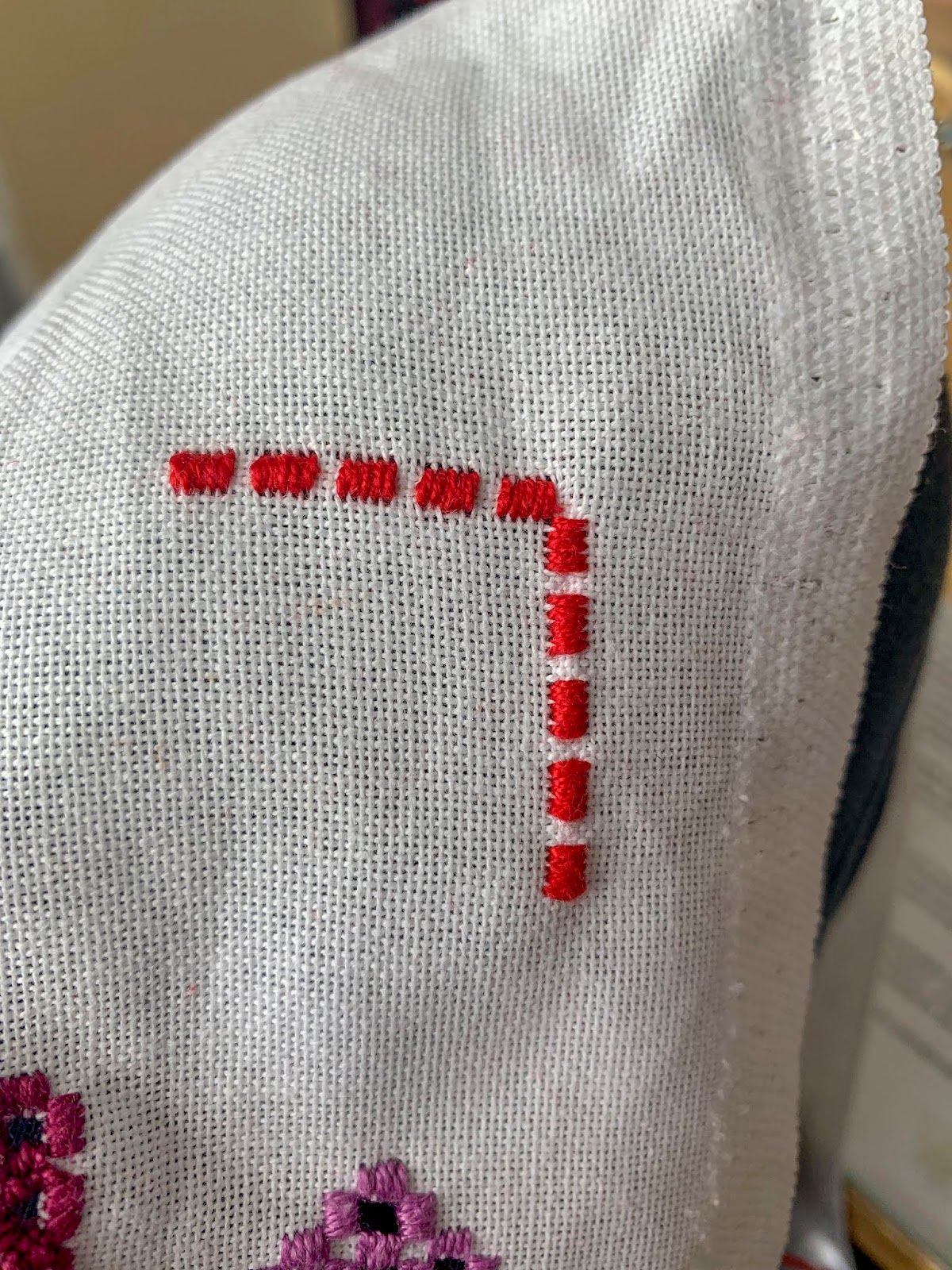 Nebudem vám písať, že je táto výšivka jednoduchá. Je jednoduchá, keď ju vyšívate desiatykrát. Na prvý pokus je to celkom náročné. Vyšívala som na perličke, ale na učenie odporúčam panamu. Potom prejdite na perličku a nakoniec na hustejšie plátno. Alebo ak máte odvahu a dosť plátna na trénovanie, tak rovno vyskúšajte hustejšie plátno. Na panamu a perličku je super tupá ihla, nebudete mať dopichané prsty a ihla prechádza plátnom oveľa jednoduchšie ako ostrá ihla. Odporúčam mať pri sebe aj lupu a dostatok bavlnky. Najlepšia je mulinka, perlovka sa mi po čase strapkala a bola akási škaredá ku koncu, ale je to na vás. Ako vidíte na fotke, vyrezáva sa stredná časť, preto si dajte pozor aby vám nitka nikdy nekončila v strede ale na vonkajšom obvode. Inak sa vám rozpadne výšivka.