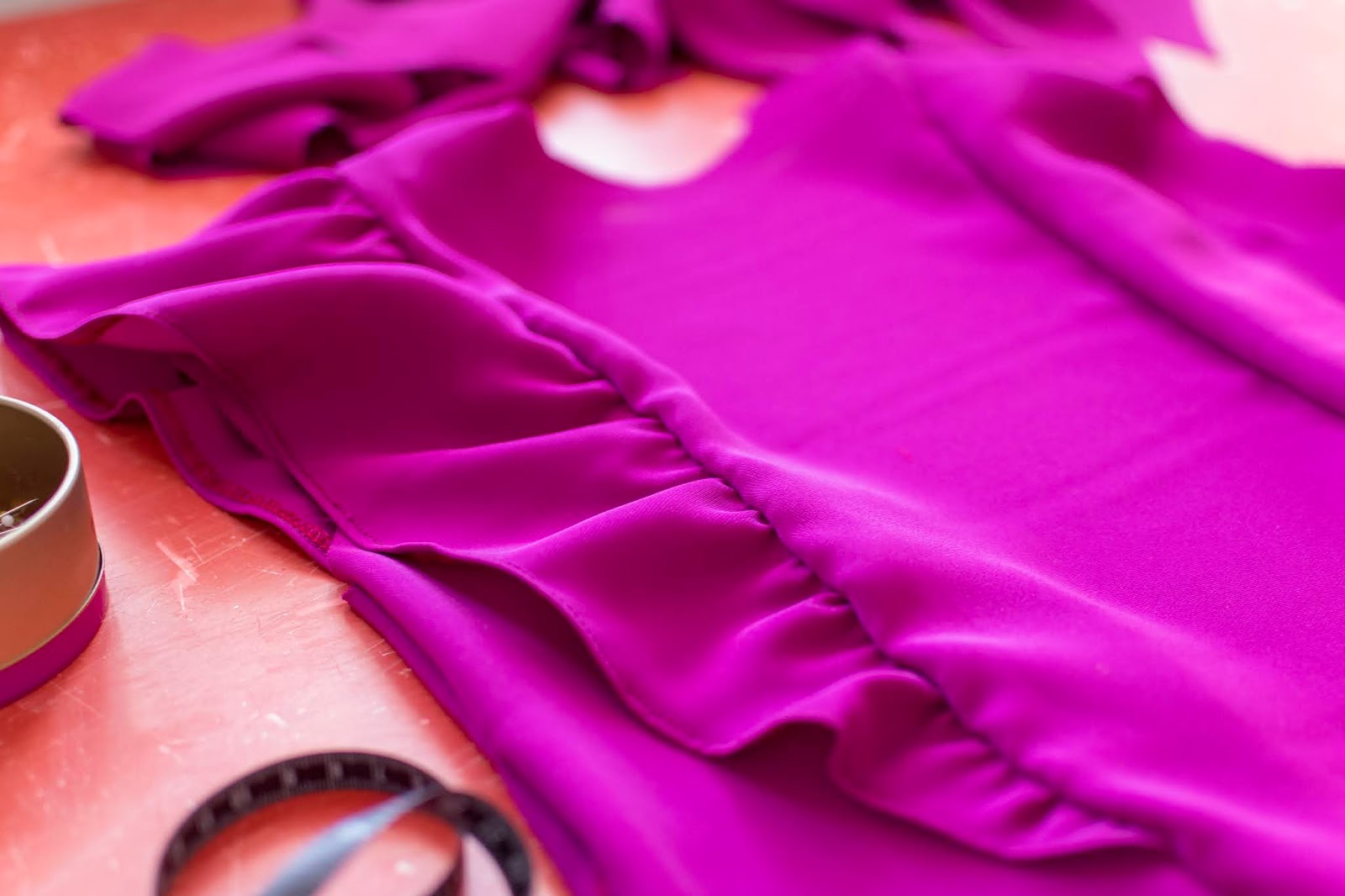 Spomínam si ako ste túto látku kupovali v chladnom decembri. Vyberala som si dve látky. Jednu som dostala na Vianoce a druhú na meniny. Prešla som sa po predajni a vybrala som dve látky, ktoré boli najmenej pravdepodobné, že si ich vyberiem. Aj mamina s Mirkou (predavačkou) sa na seba pozreli a urobili také to gesto .. jemne natočili hlavu doľava, pokrútili kútiky a prekvapene zdvihli obočie. Povedala som si, že si vyberiem také farby, ktoré ešte nemám a ktoré ešte viac rozžiaria môj, už aj tak farebný, šatník. Vyhrala to fuchsiová a kvetovaná, z ktorej sme práve dnes ušili druhé šaty. Mrzí ma, že žiadny fotoaparát (skúšala som štyri) nezachytili presnú farbu látky, ale je to fuchsiová, nie je fialová ani ružová :). V článku si môžete pozrieť fotoreport ako sme šaty šili a takisto aj dôvod prečo som si vybrala práve takýto strih. Inšpirujte sa.