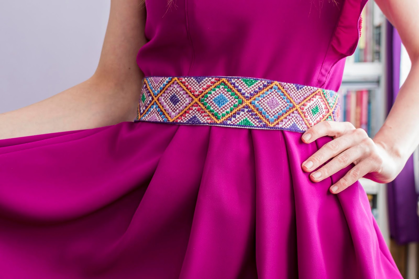 Šaty šila mama, to je vidno, sú bez chyby. Ja som robila ako väčšinou pomocné práce t.j. vystrihnutie, zošpendlenie, obšitie, skúšanie, žehlenie a samotné upratovanie a príprava na šitie. Sú to dôležité činnosti :)))) o tom niet pochýb. A samozrejme som si robila poznámky a fotky. Dokonale sa k nim hodil opasok, ktorý som nedávno vyšívala, pozri článok TU. Tak sme nakoniec zo zvyšku látky ušili viazanie na opasok t.j. sú dokonalá dvojka. Zostal mi ešte rovnako široký pás, ktorý sme nakoniec odstrihli z dĺžky a z toho plánujem takisto urobiť opasok a niečo pekné na neho vyšiť.