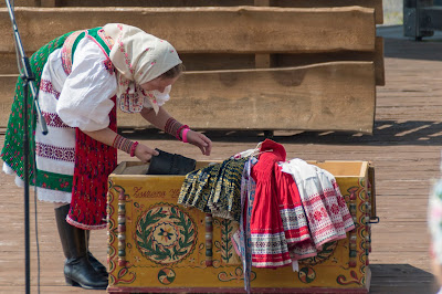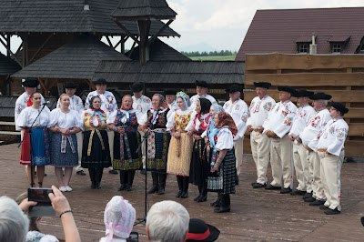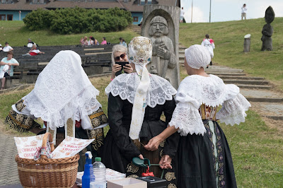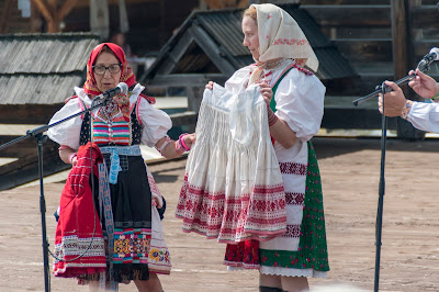 Vo Východnej som bola po prvýkrát. Všetko bolo pre mňa nové. Elenka, ktorá ma ochotne zviezla z BB, lebo mala rovnakú cestu, mi porozprávala, čo kde sa nachádza, keď je tu festival Východná. Elenka chodí na festival pod záštitom úľuvu, v ktorom učí vyšívanie krivou ihlou a šitie krojov. Absolvovali sme spolu kurzy horehronskej výšivky 1 a 2ku sme kvôli covidu nedokončili. Porozprávala mi v ktorej drevenici sa čo koná, ukázala mi amfiteáter, veľký aj malý, a ja som chodila s otvorenými ústami. Kedže som tu ešte nebola, tak neviem ako to tu vyzerá, keď je to plné ľudí, ale o rok si to, verím, budem môcť pozrieť a porovnať. Po prehliadke priestoru bez ľudí, zistenia kde si môžeme nabrať vodu a kde je wc, sme sa porozhliadli aj po účastníkoch stretnutia. Prešli sme na kopec a tam sme našli stánok s občerstvením a prvých milovníkov a zberateľov v krojoch, ktorí sa ukrývali pred slnkom v tieni. Ešte chcem napísať, že stretnutie sa konalo za stanovených bezpečnostných opatrení t.j. vedľa seba sedeli iba rodiny, alebo osoby, ktoré sú na seba zvyknuté, boli sme v exteriéri, bolo nás do 100 ľudí, pri vstupe nechýbala dezinfekcia atď.
