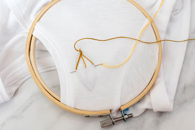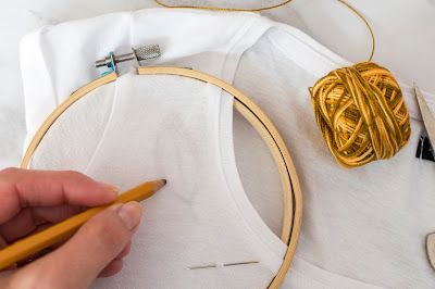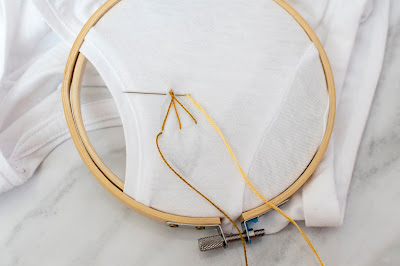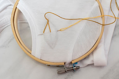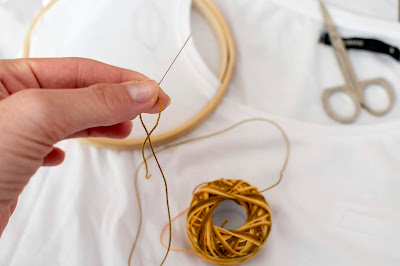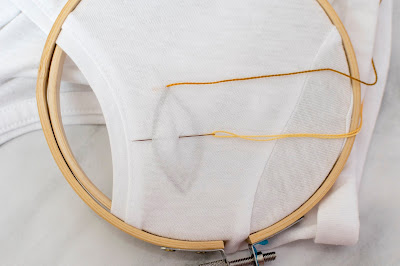 Ak sa rozhodnete pre elastický materiál, odporúčam ho podlepiť vlizínom t.j. lepiacim plátnom. Plátno elastickú textíliu spevní a bude sa vám lepšie vyšívať. Tento krok urobte hneď na začiatku. Potom tričko natiahnite na vyšívací kruh. Ja som použila malý kruh. Navlečte si bavlnku do ihly a ideme na to.