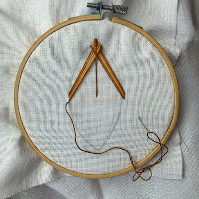 - Ihlu zapichnite ešte raz tak, aby vyšla lícnou stranou na jednej strane okraju predkresleného listu (tak ako to vidíte na fotke)